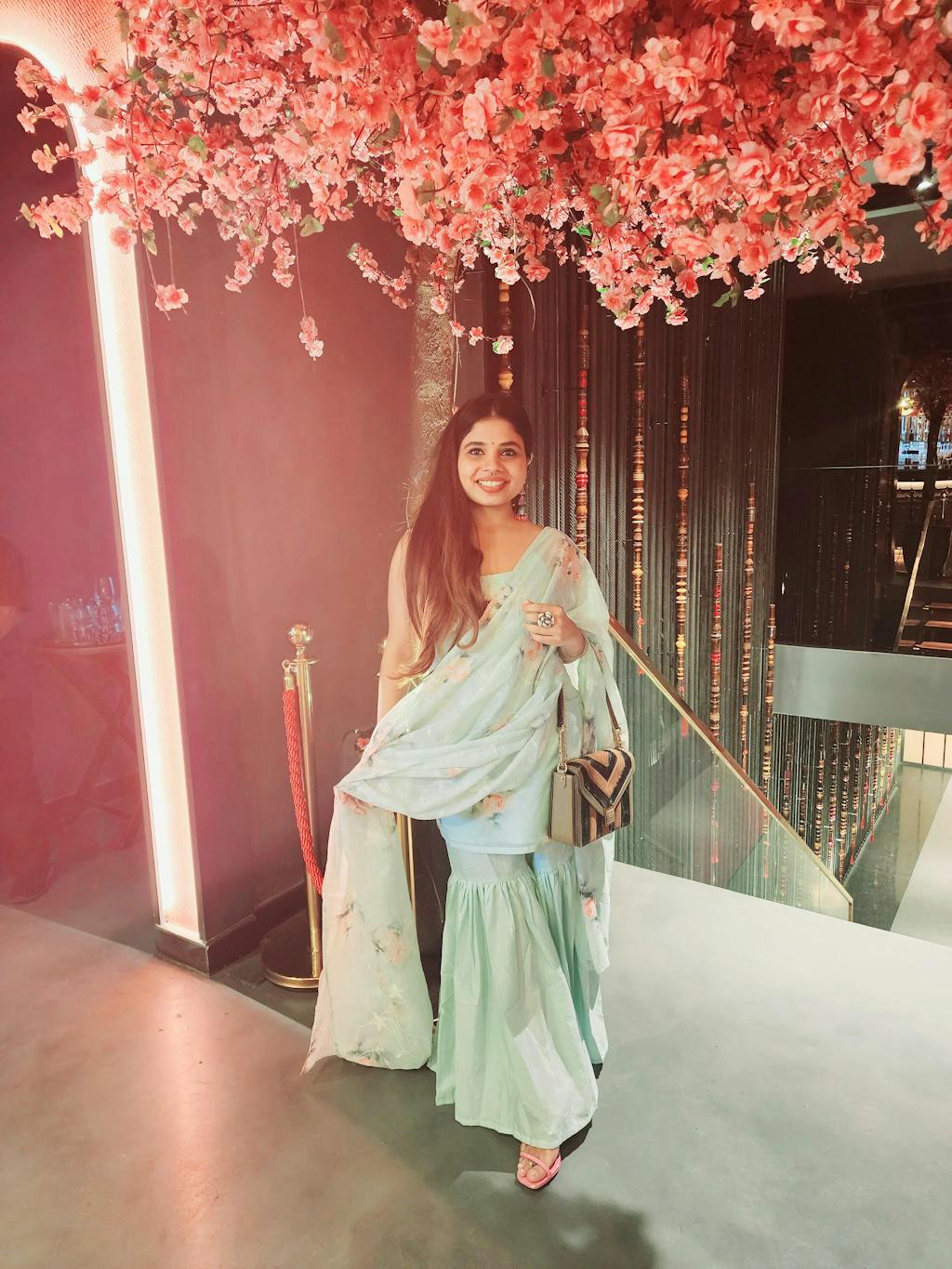Our 3-piece green organza set features a straight-fit kurti with a strappy neck and floral print. Complemented with sharara pants, a partially elasticated waistband, and a matching dupatta with taping border, this style is perfect for daytime festivities.