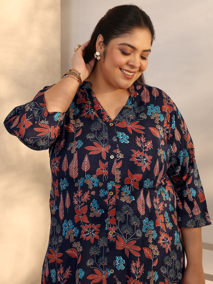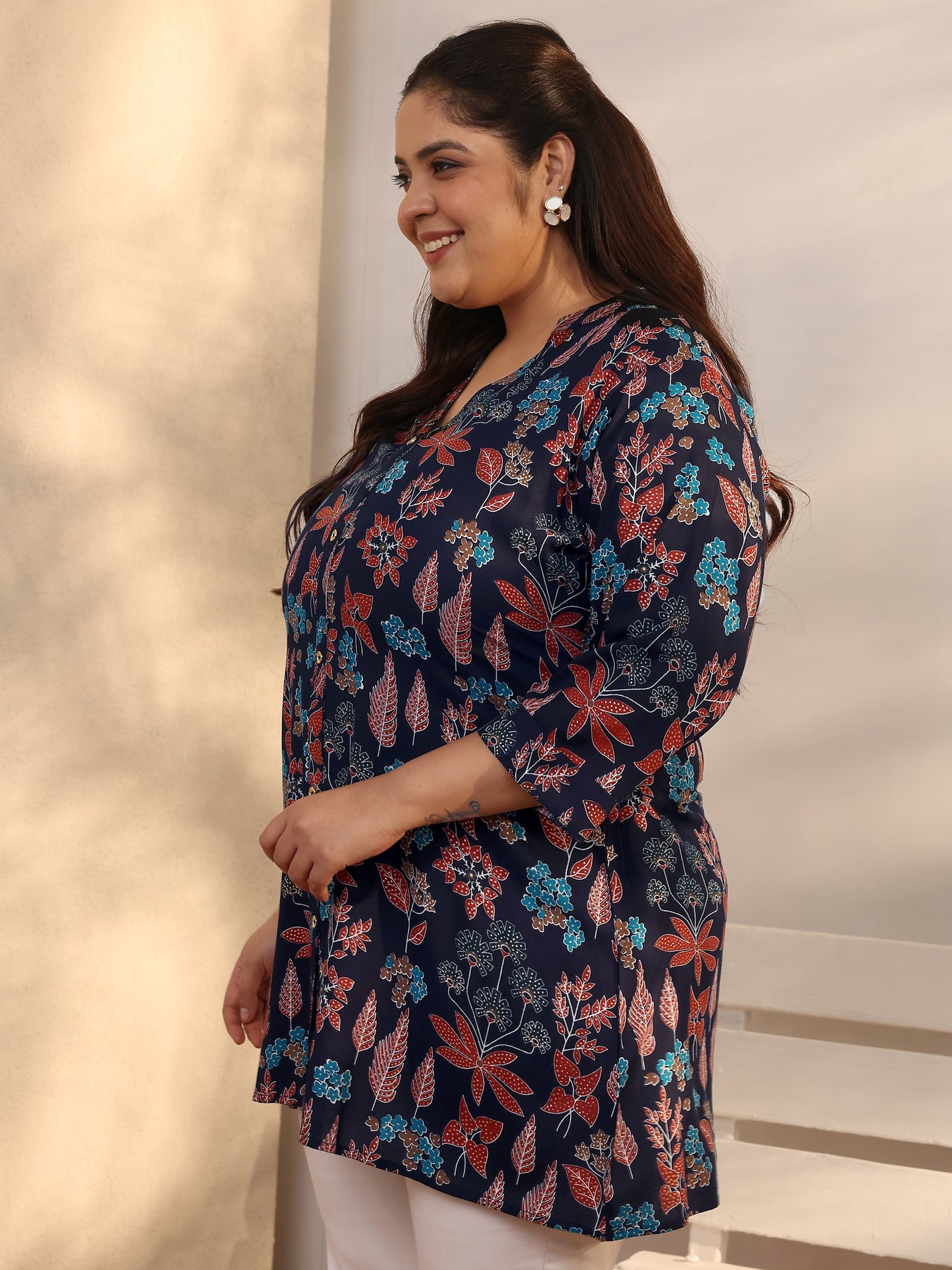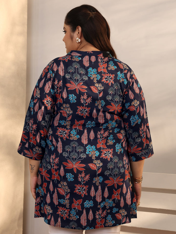Plus Size Navy Blue Printed Silk Blend Straight Short Kurti