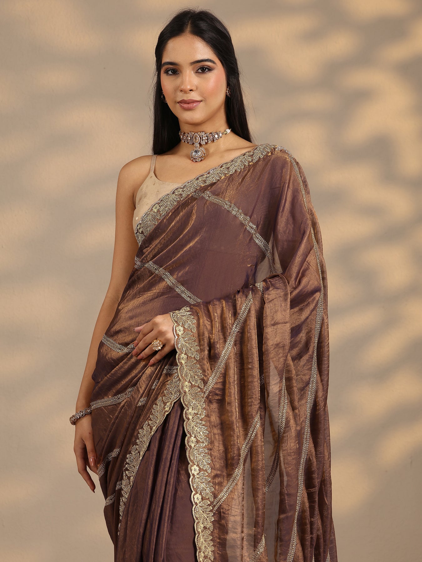 Our brown printed silk blend saree features captivating embellishments. Complemented with a Unstitched blouse. This charming saree is perfect for festive occasions.