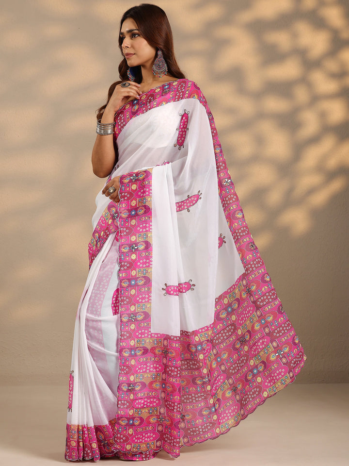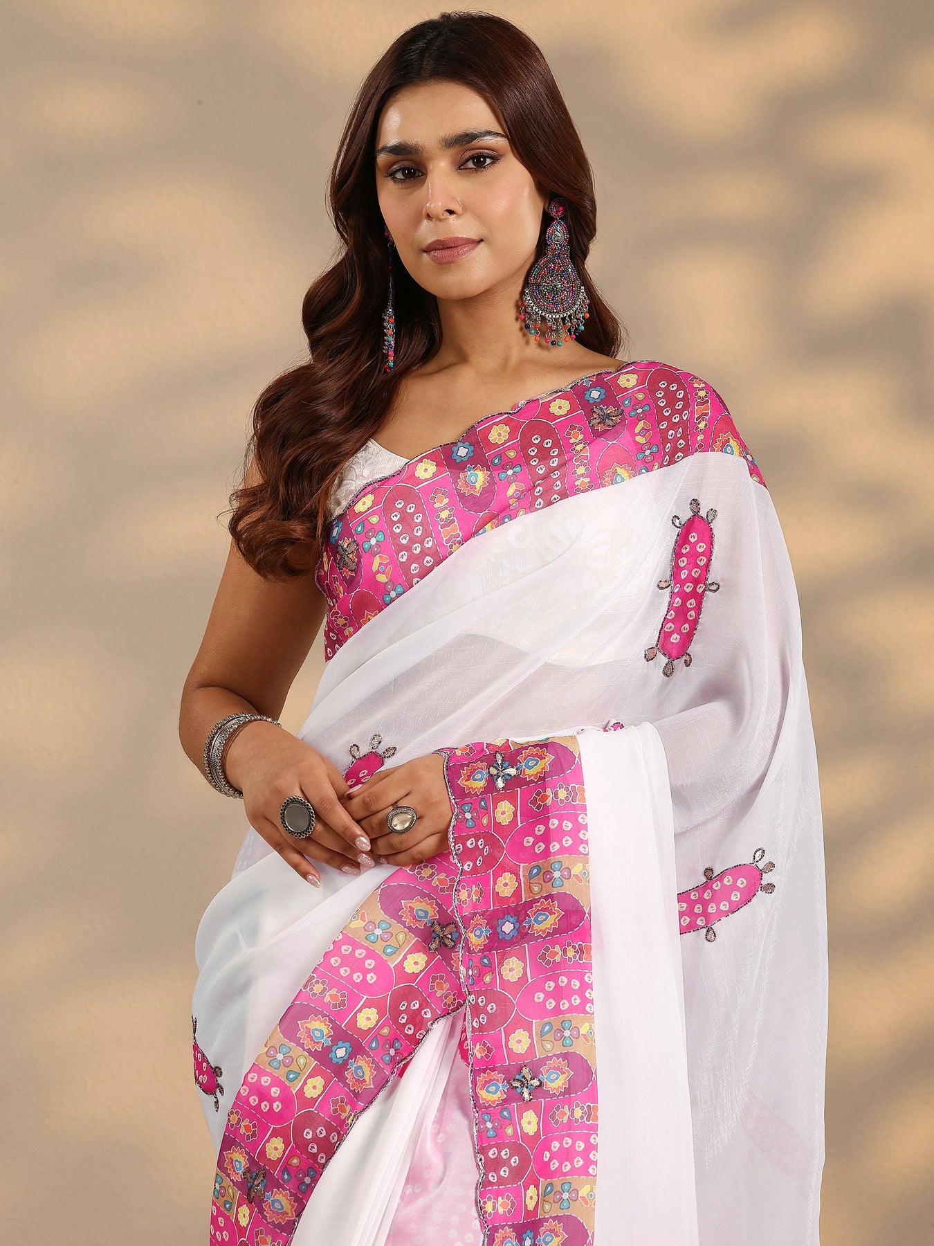 Off White Printed Silk Blend Saree With Unstitched Blouse Piece