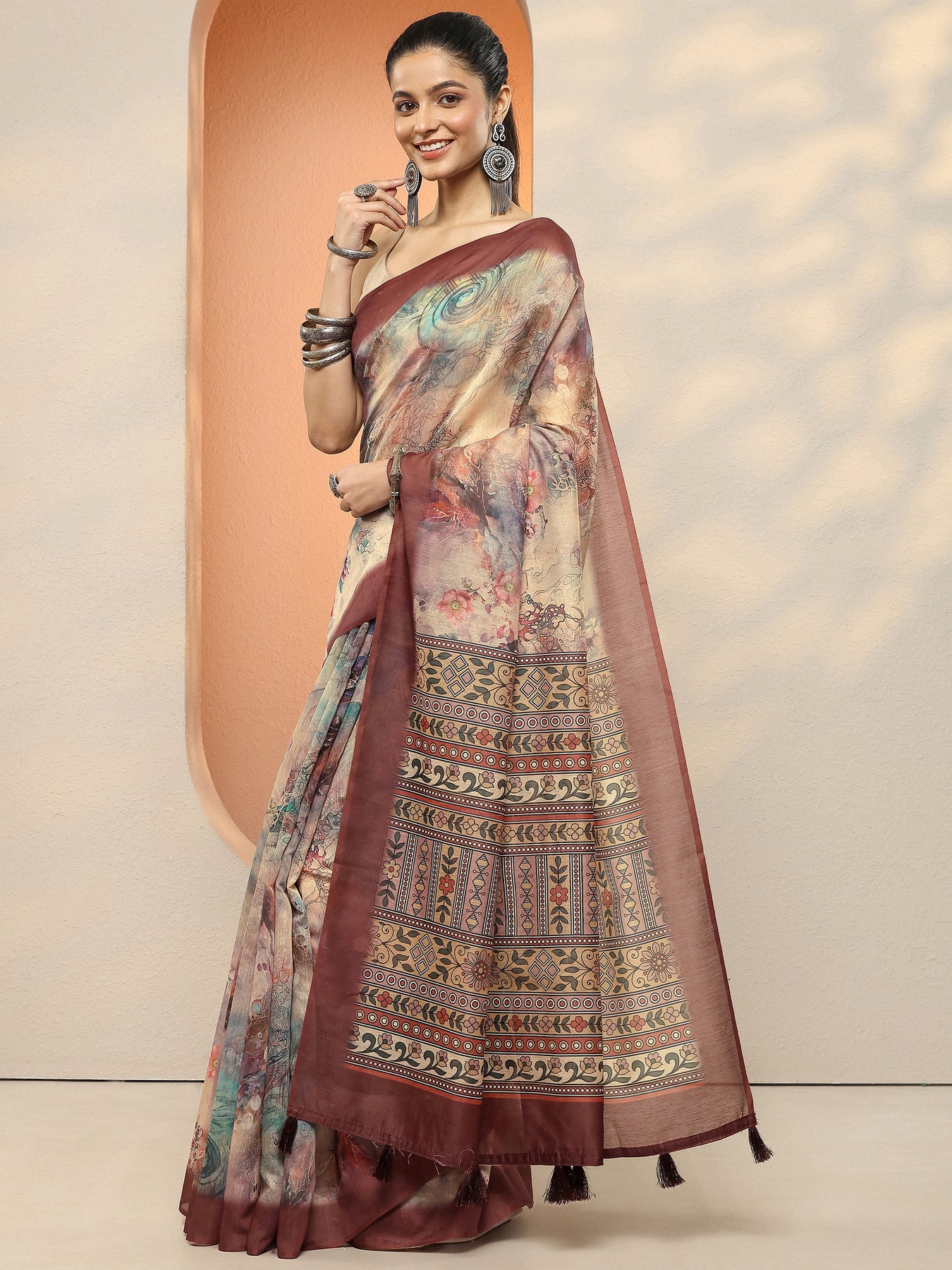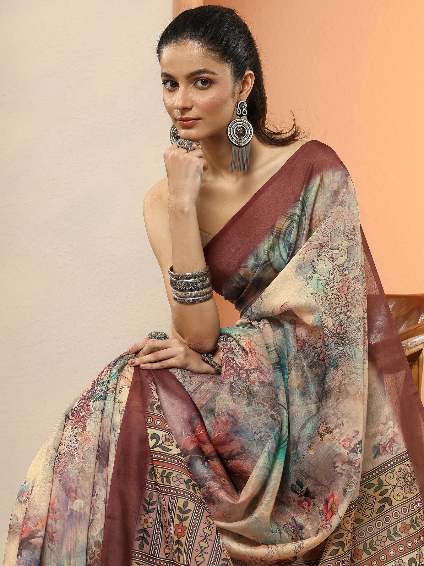 Peach Printed Silk Blend Sarees With Unstitched Blouse Piece