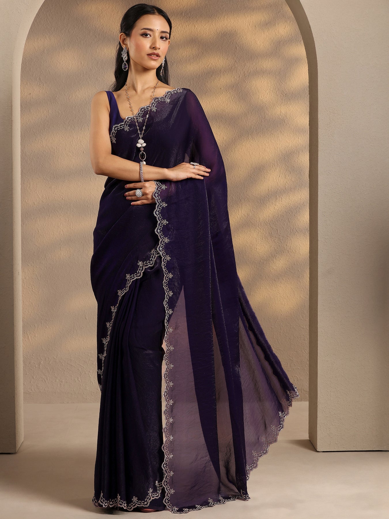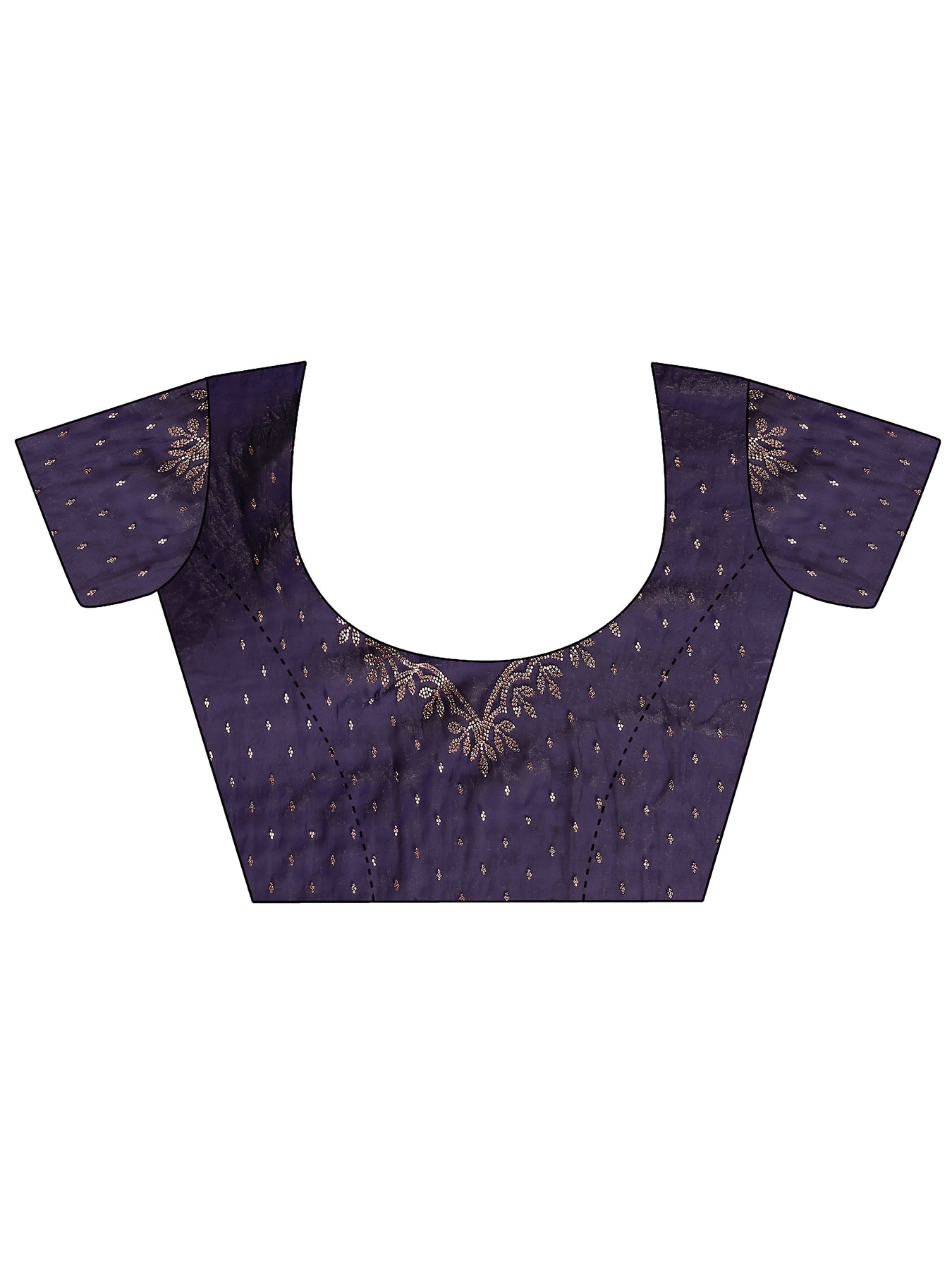 Our violet silk blend saree. Complemented with an unstitched blouse piece. This charming saree is perfect for festive wear.