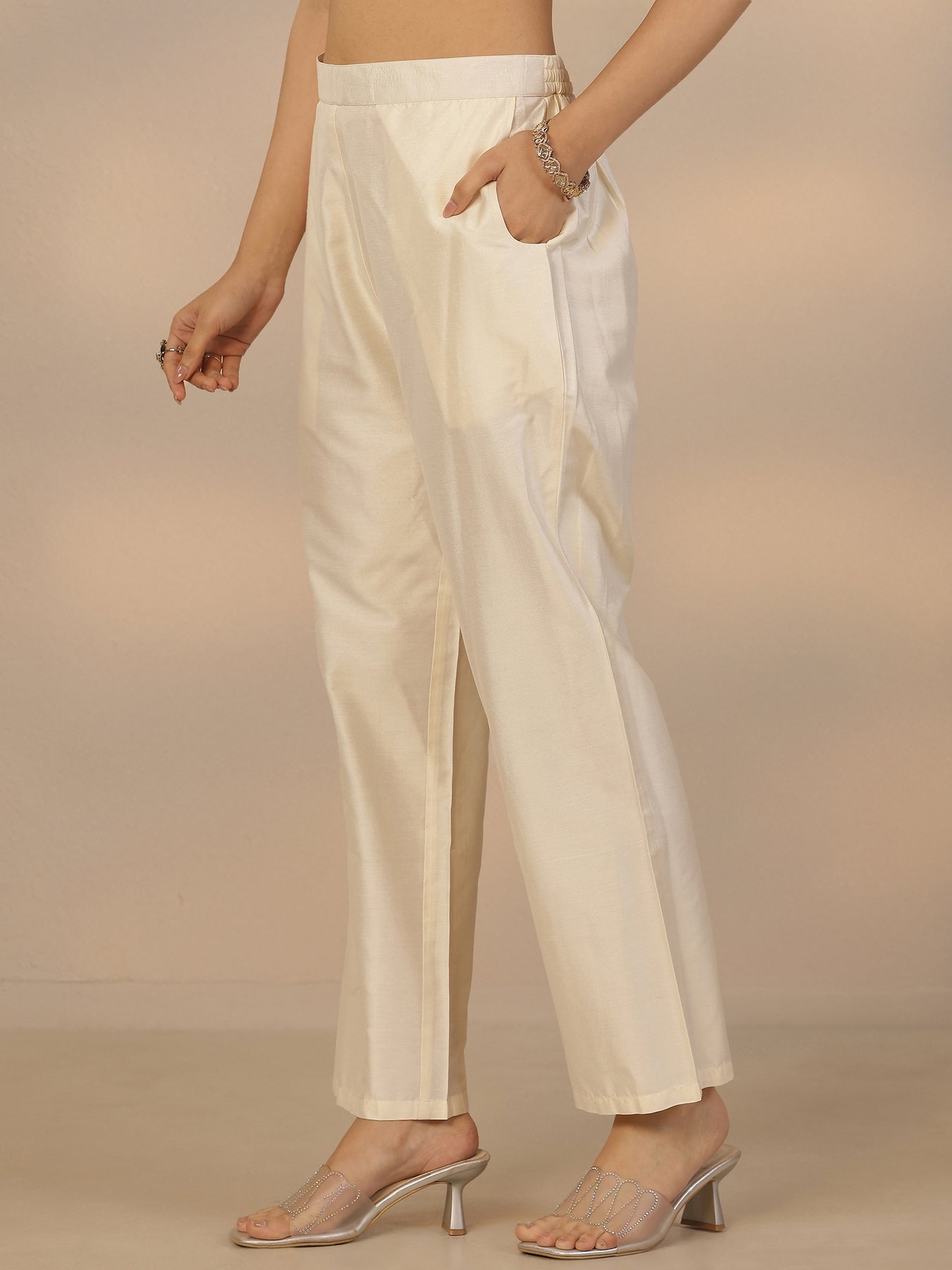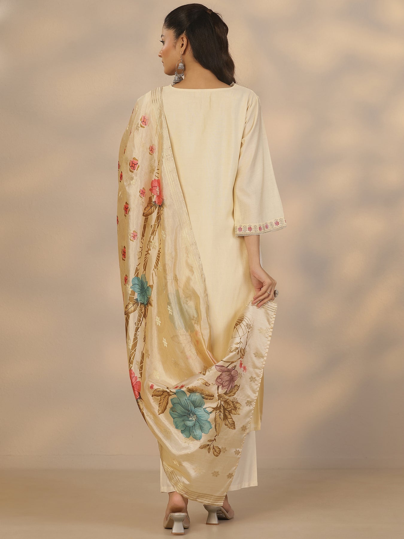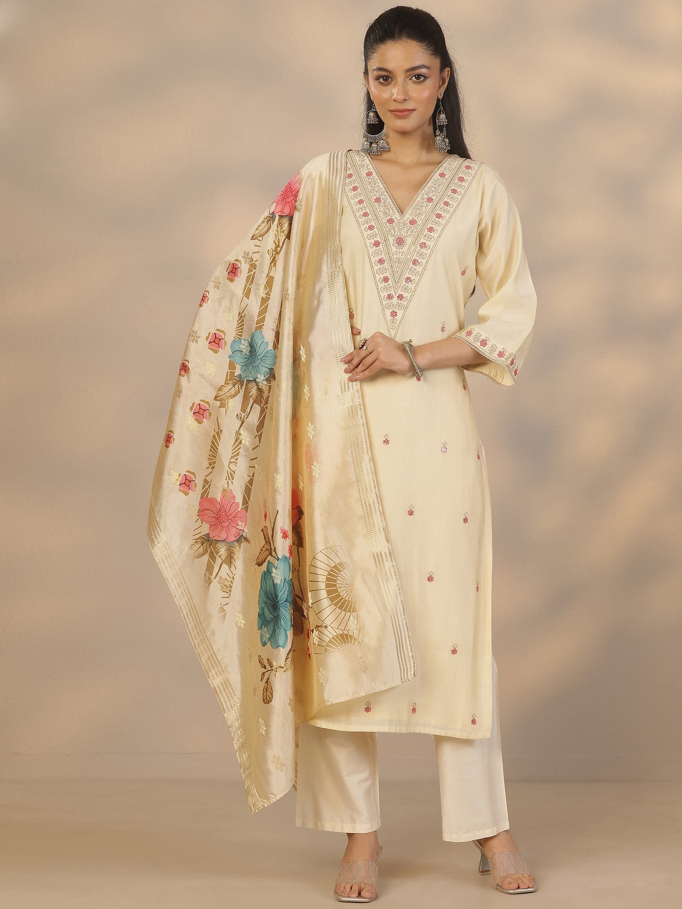 Cream Embroidered Silk Blend Straight Suit Set With Dupatta