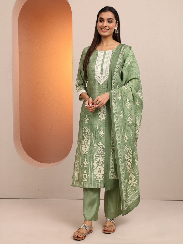 Green Printed Silk Blend Straight Suit Set With Dupatta