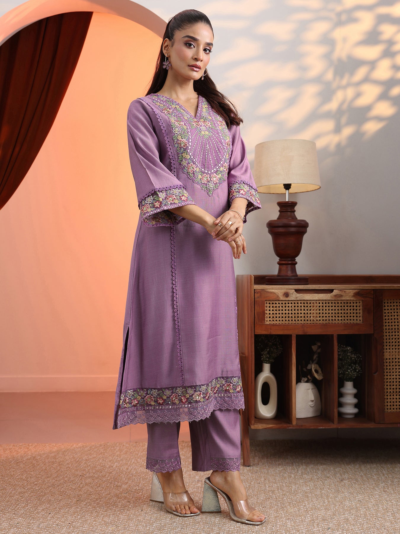 Lavender Embroidered Silk Blend A-Line Suit Set With Dupatta