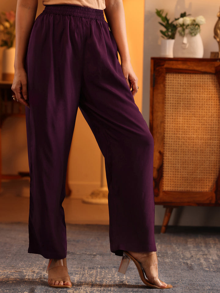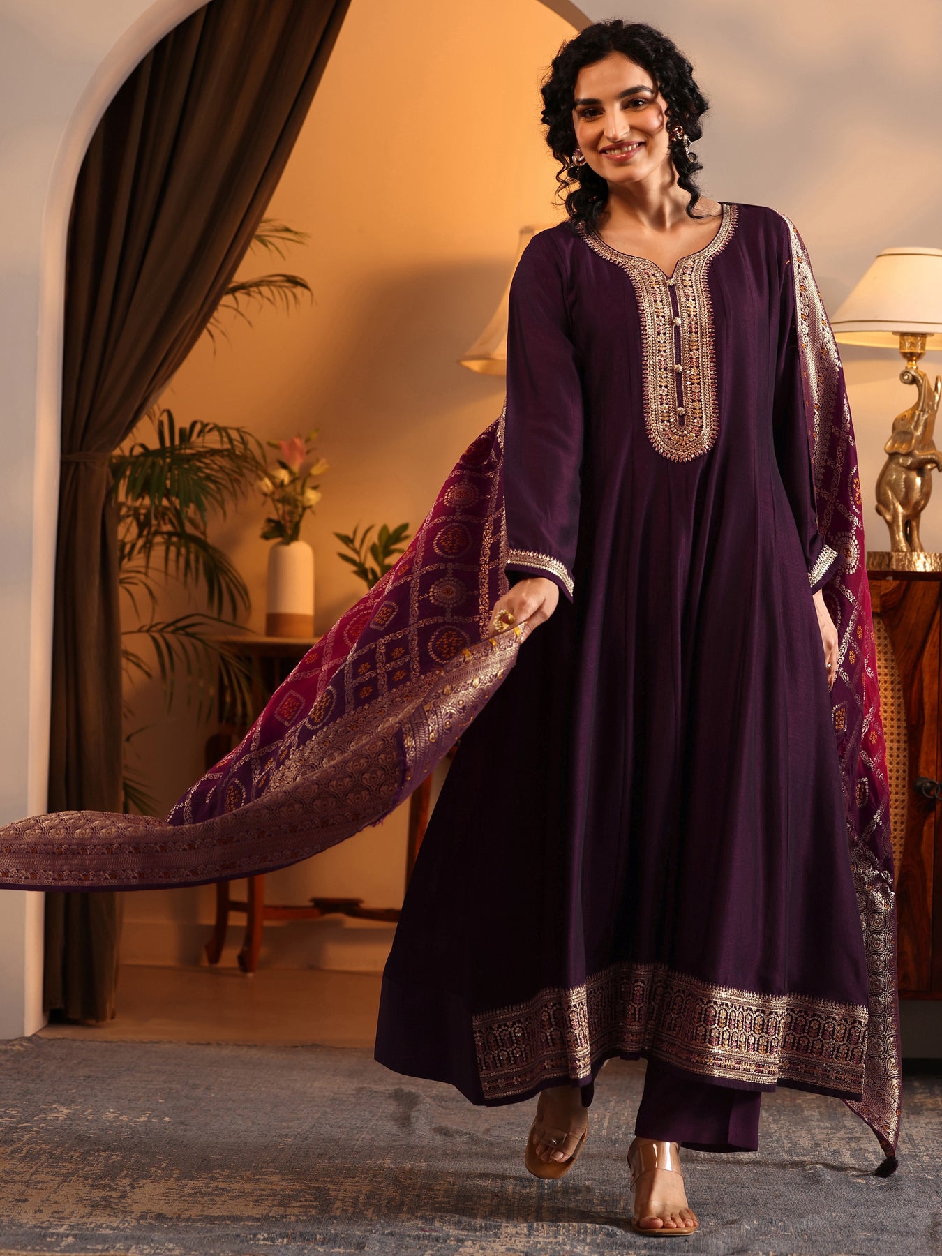 Our 3-piece purple silk blend Anarkali kurta set features a U-notched neckline, regular sleeves, and a statement yoke. Complemented with lining and straight pants with a partially elasticated waistband and 2 pockets, and an embroidered dupatta. Adorned with embroidered accents and woven design, this style is perfect for festive wear.