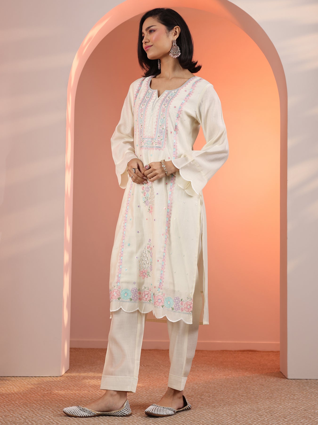 Our 3-piece Off White Silk blend Straight-fit Kurta Set features a Round Neckline, Regular Sleeves, and statement Yoke. Complemented with Lining and Straight Pants with a Partially Elasticated waistband and 2 pockets, and a Solid dupatta. Adorned with Floral Embroidered accents, this style is perfect for Semi festive wear.