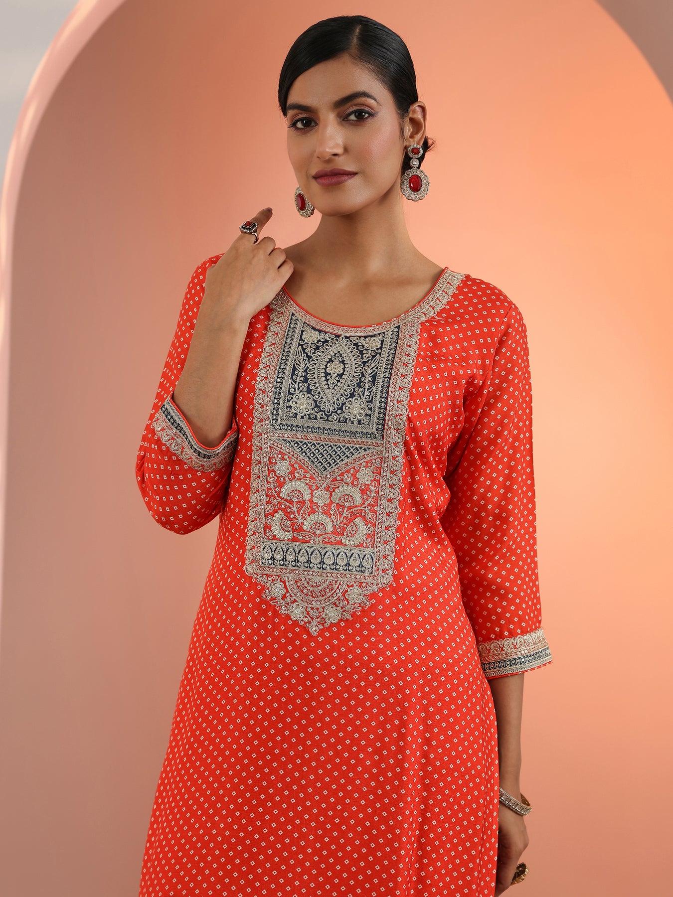 Our 3-piece Red Silk blend Straight-fit Kurta Set features a Round Neckline, Regular Sleeves, and statement Yoke. Complemented with Straight Pants with a Partially Elasticated waistband and 2 pockets, and a Printed dupatta. Adorned with Bandhani Printed embellishments, this style is perfect for Festive wear.