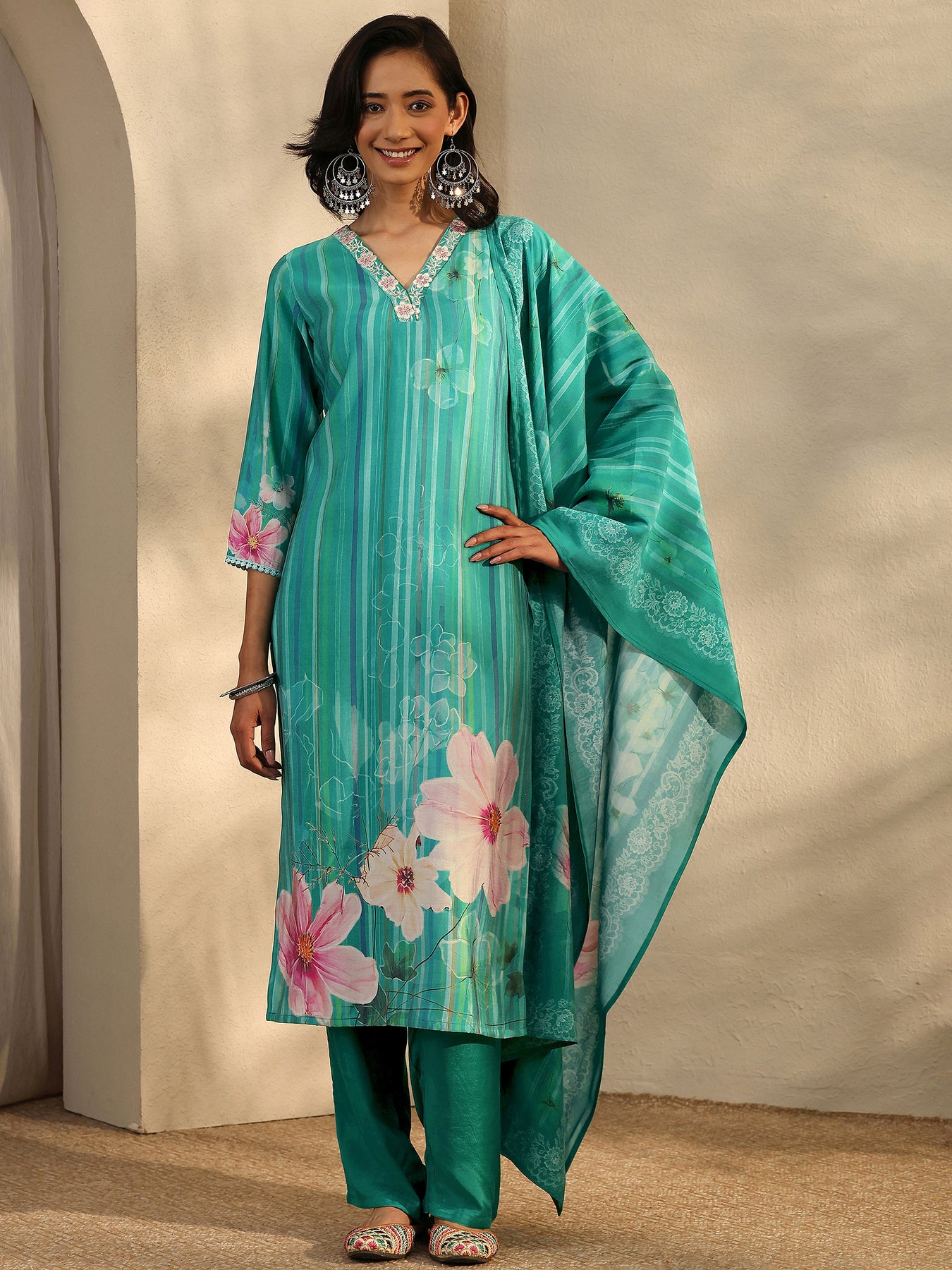 Teal Printed Silk Blend Straight Suit Set With Dupatta