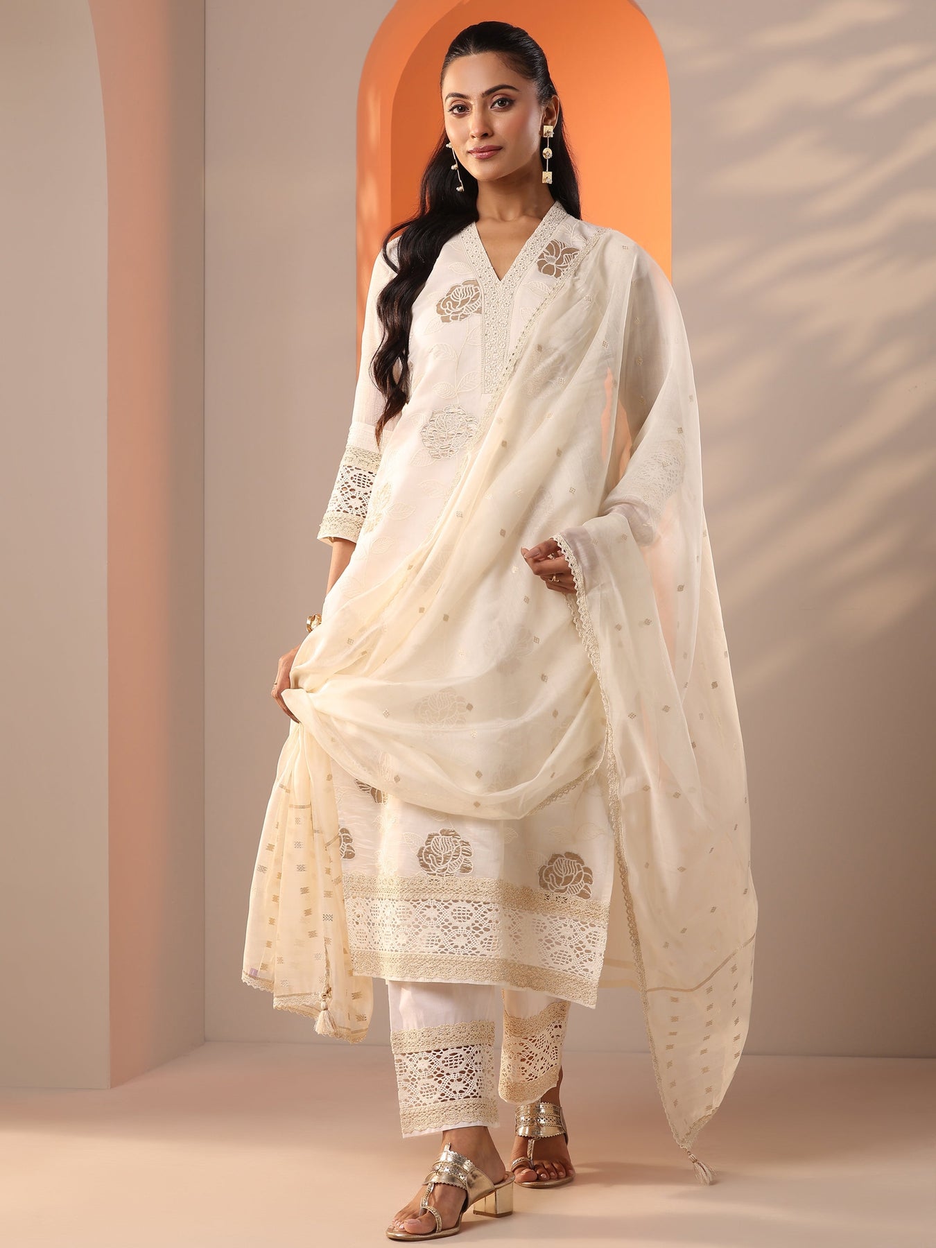 Libas Art Off White Embroidered Silk Blend Straight Suit Set With Dupatta