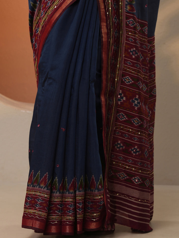 Navy Blue Solid Silk Blend Saree With Unstitched Blouse Piece