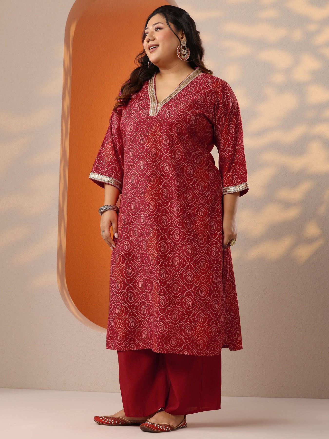 Our 3-piece Magenta Silk blend Kurta Set features a Straight-fit silhouette with a V-Neckline, Regular Sleeves, and statement yoke. Complemented with Straight Pants with a Partially Elasticated waistband, and a Leheriya Print dupatta. Adorned with Bandhani inspired print, this style is perfect for Festive occasions.