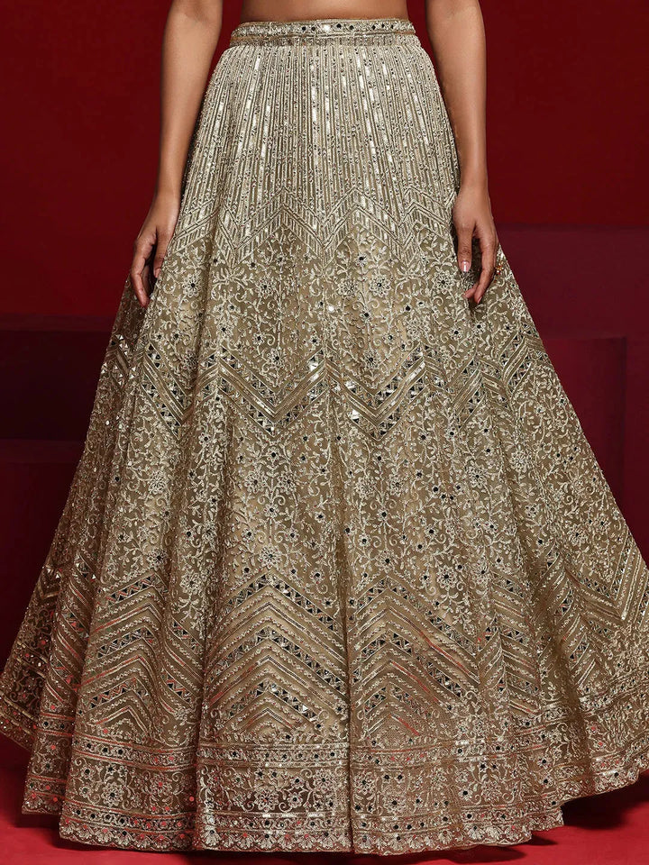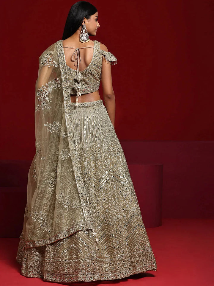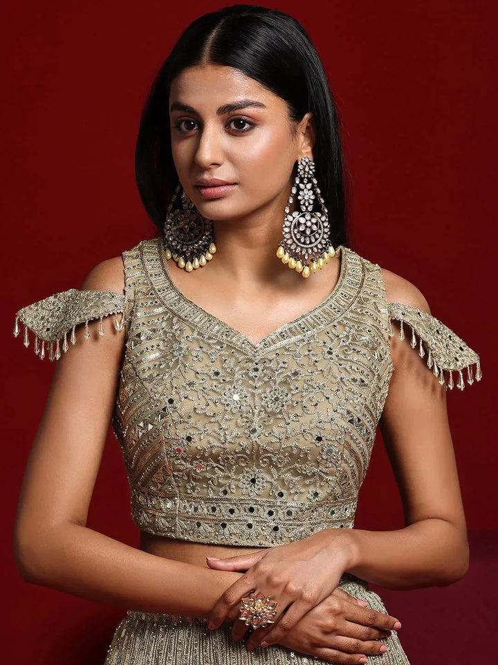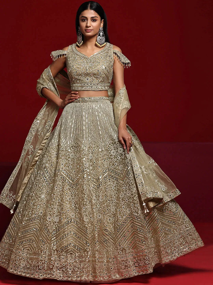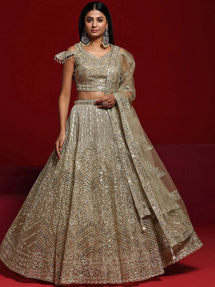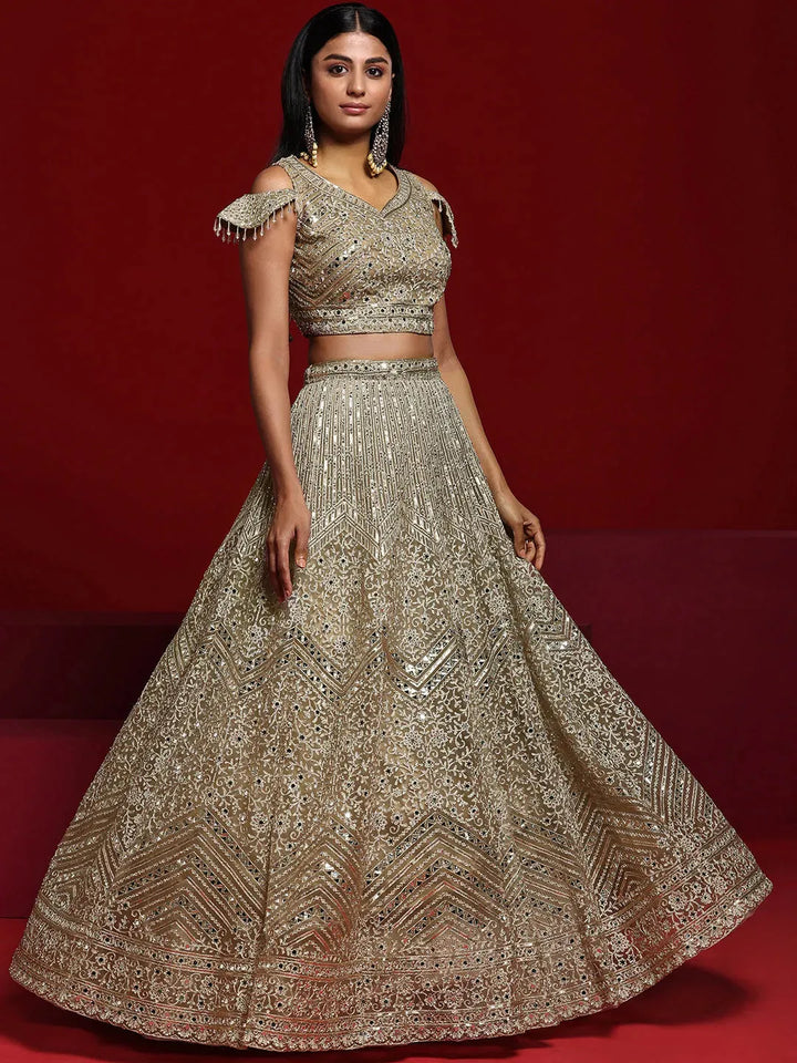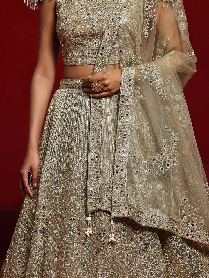 Our 3-piece beige embroidered net lehenga set features a cold-shoulder crop top with a sweetheart neckline. Complemented with a flared lehenga and a dupatta. Adorned with sequins, thread work and mirror detailing, this style is perfect for festive celebrations.