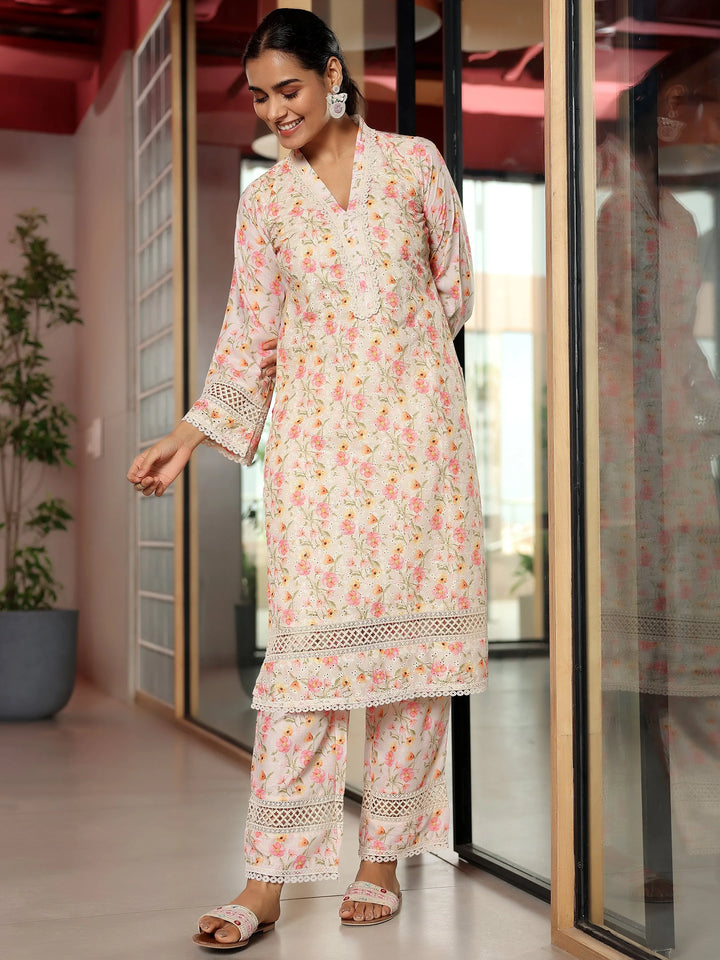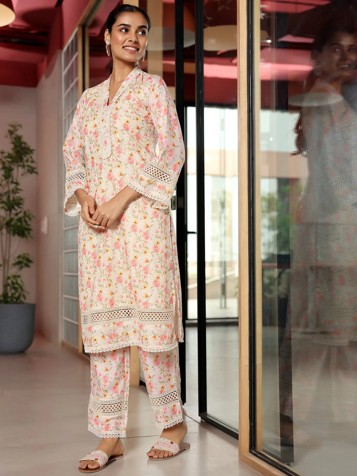 Our 2-piece beige printed cotton kurta set features a straight-fit floral print kurta with a V-neckline and three-quarter full sleeves. Complemented with matching trousers with a partially elasticated waistband and roomy pockets. Adorned with lace accents and cutwork, this style is perfect for casual outings.