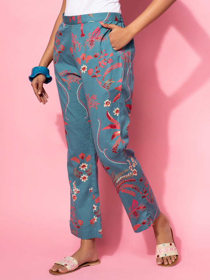 Our 2-piece blue printed cotton kurta set features a Pathani kurta with a V-neckline and three-quarter sleeves. Complemented with a partially elasticated waistband and roomy pockets. Adorned with blossoming floral print and fabric-trim accents, this style is perfect for casual outings.