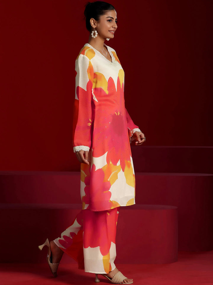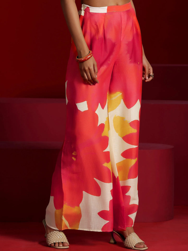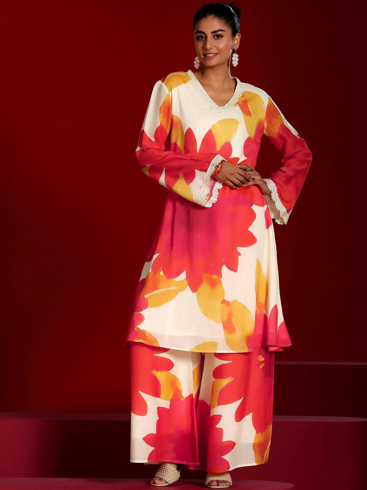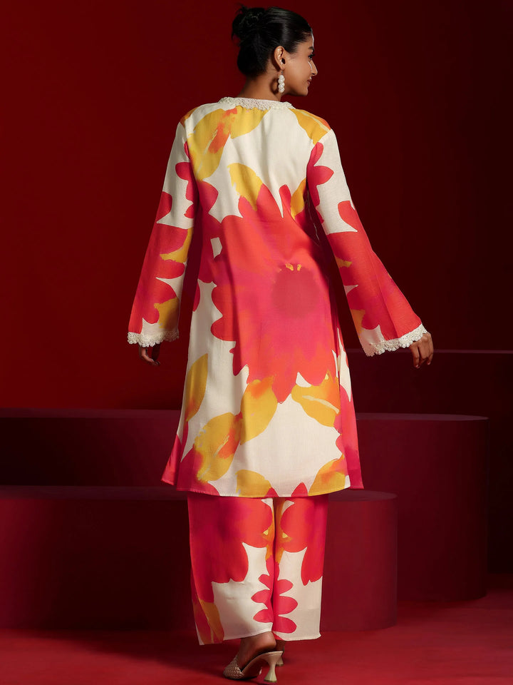 Our 2-piece Red and Yellow printed Linen co-ord set features a Straight-fit Tunic with a V-Neck neckline and Long Sleeves. Complemented with matching Palazzos with an Elasticated waistband. Highlighted with Printed, this style is perfect for Festive.