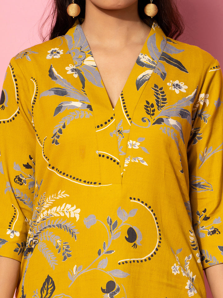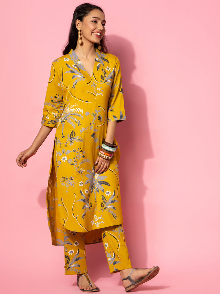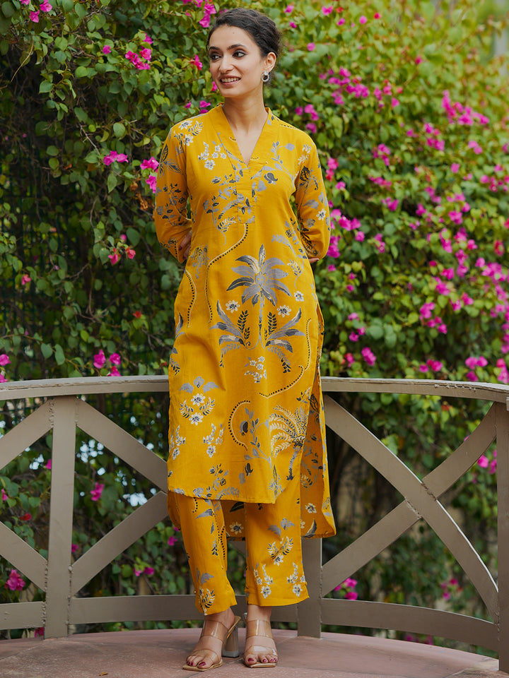 Our 2-piece yellow printed cotton kurta set features a Pathani kurta with a V-neckline and three-quarter sleeves. Complemented with trousers with a partially elasticated waistband. Adorned with captivating floral print, this style is perfect for casual outings.