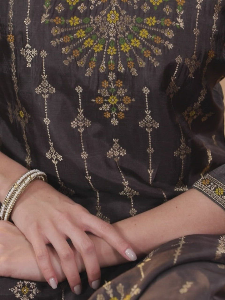 Our 3-piece charcoal grey woven design silk blend suit set features a straight-fit ethnic woven design kurta with a V-neckline, three-quarter sleeves, and a statement yoke. Complemented with trousers with a fully elasticated and roomy pockets, and a dupatta. Adorned with tassel detailing, this style is perfect for light festivities.