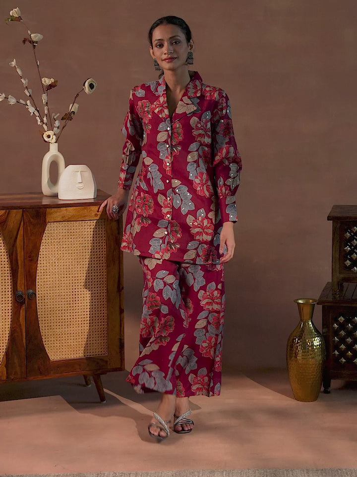 Our 2-piece maroon printed silk blend co-ord set features a buttoned-down shirt with a lapel collar and comfortable sleeves. Complemented with palazzo trousers with a partially elasticated waistband. Adorned with captivating floral prints and stylish buttons, this style is perfect for casual outings.