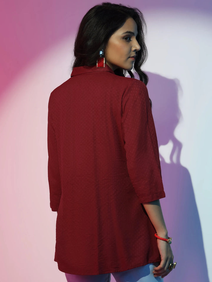 Our burgundy printed viscose rayon kurti features a shPairt collar neckline and three-quarter sleeves. Highlighted with captivating self design, this style is perfect for casual wear.