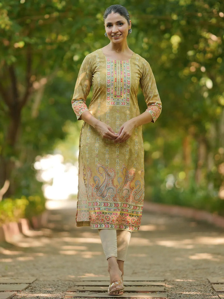 Our mustard yellow printed straight-fit kurta, crafted in crepe fabric, features a round neckline and three-quarter sleeves. Elevated with ethnic motifs prints, this style is perfect for casual outings.