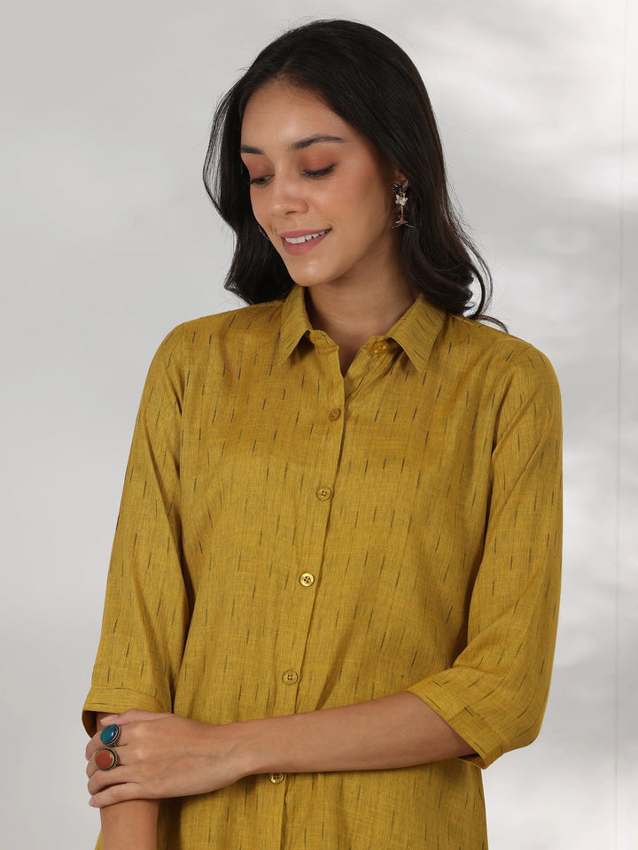 Our mustard printed viscose rayon kurti features a shPairt collar neckline and three-quarter sleeves. Highlighted with captivating self design, this style is perfect for casual wear.