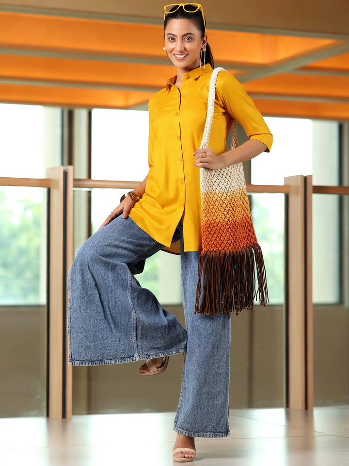 Our mustard solid rayon straight tunic features a shirt-style collar with buttoned-down detailing and three-quarter sleeves. Highlighted with stylish buttons, this is perfect for work and beyond.