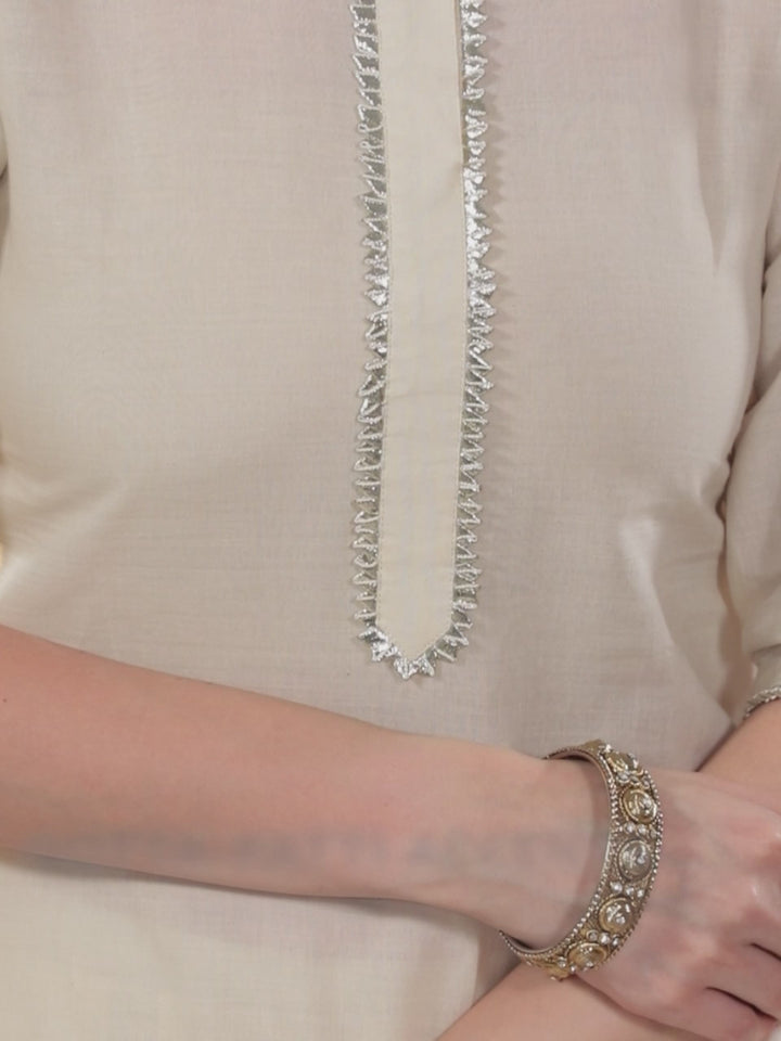 Our 3-piece off-white and gold cotton suit set features a straight-fit kurta with a round neckline and three-quarter sleeves. Complemented with straight pants and a matching dupatta. Adorned with mirrorwork detailing, this refreshing style is perfect for light festivities.
