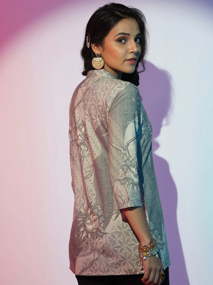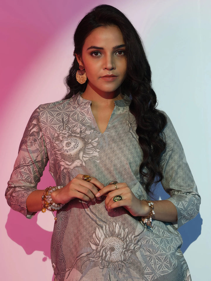 Our off-white printed linen straight kurti features a mandarin notched neckline and three-quarter sleeves. Highlighted with captivating floral prints, this style is perfect for casual outings.