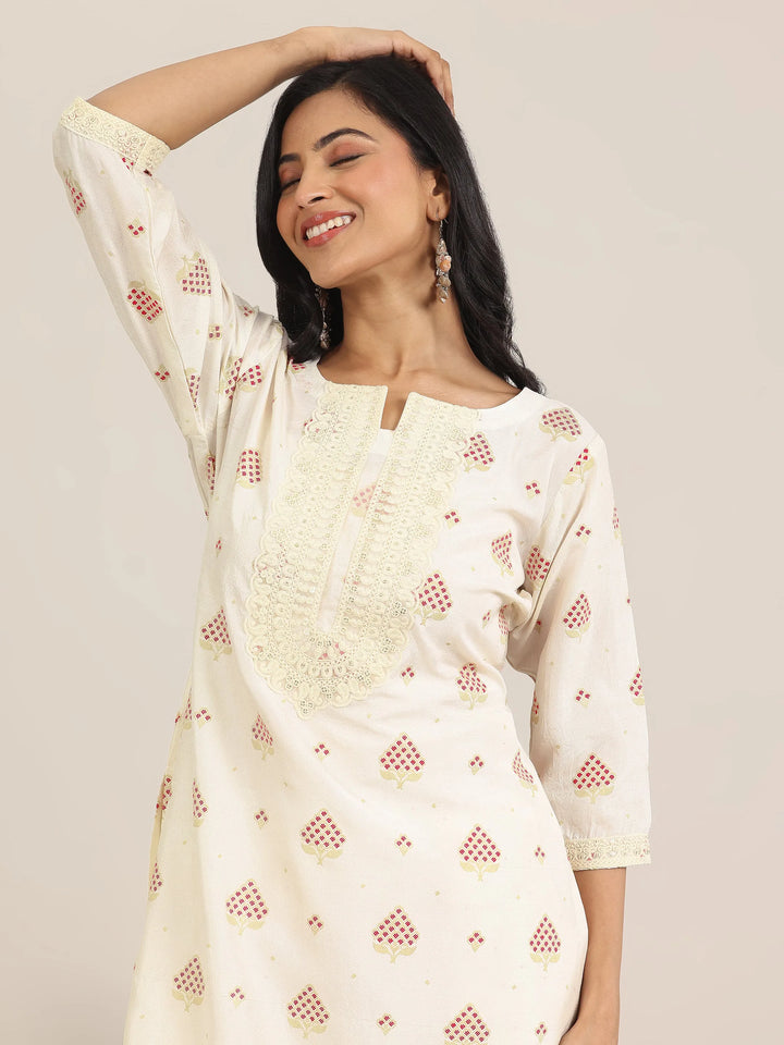 Our 3-piece off white printed silk blend straight suit set features a kurta with a round neckline, three-quarter sleeves, and a statement yoke. Complemented with Salwar trousers with a partially elasticated waistband and roomy pockets, and a dupatta. Highlighted with lace detailing, this style is perfect for light festivities.