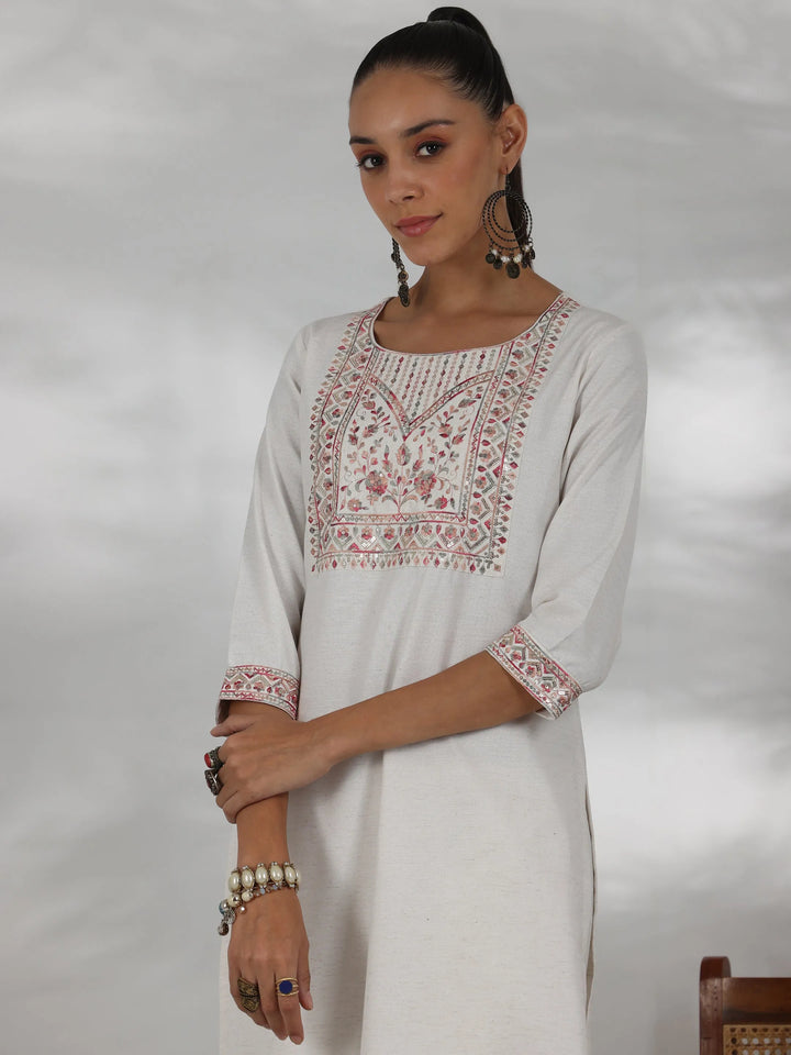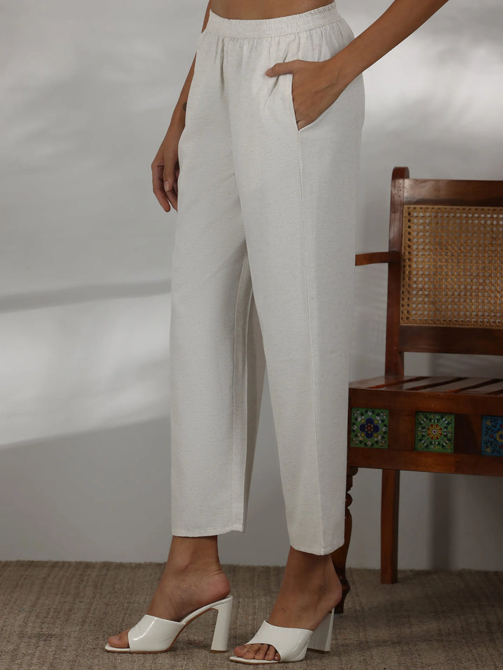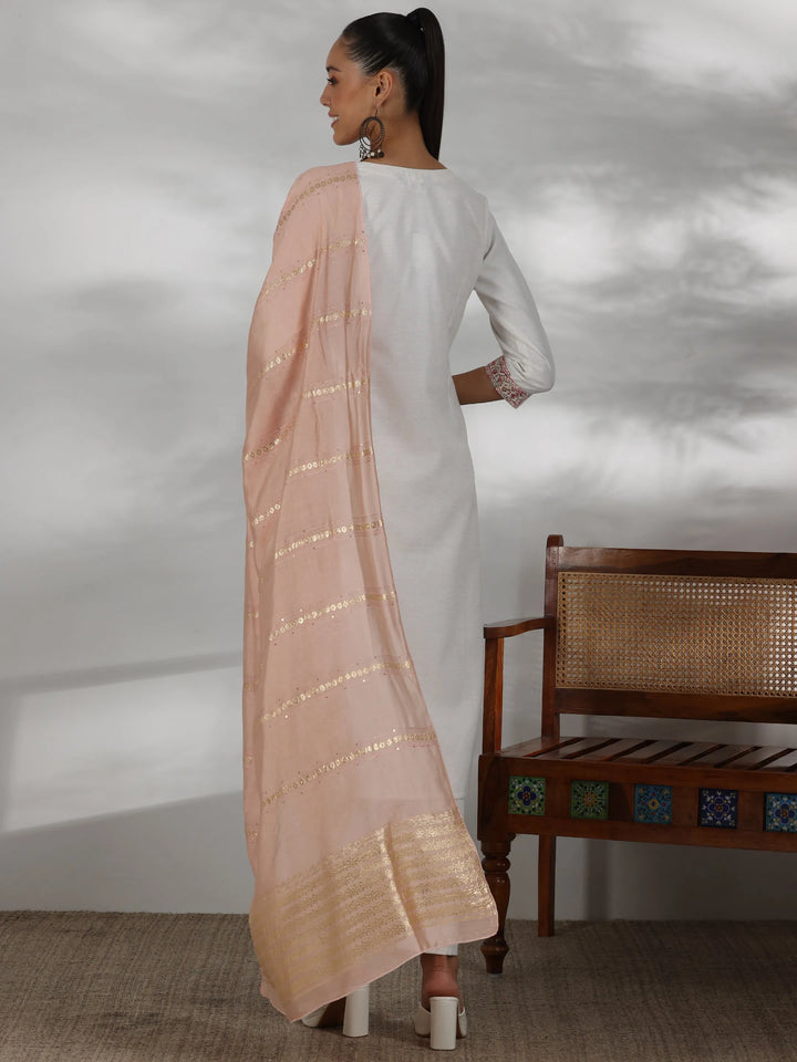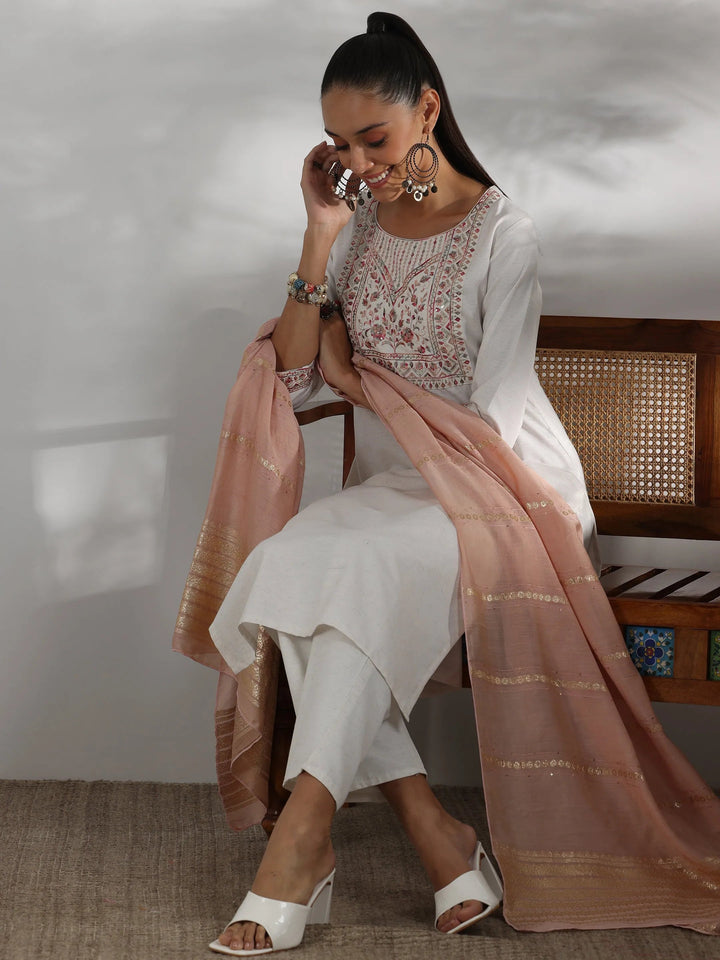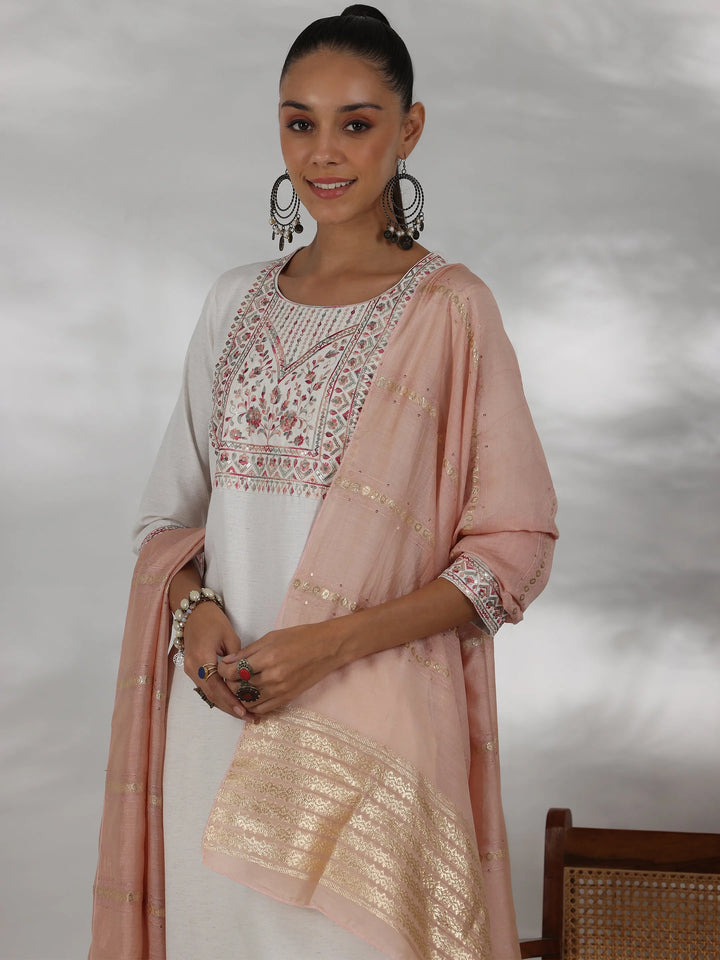 Our 3-piece off-white yoke design cotton blend straight suit set features a kurta with a round neckline, three-quarter sleeves, and a statement yoke. Complemented with trousers with a fully elasticated waistband and roomy pockets, and a dupatta. Highlighted with captivating embroidery and sequins, this style is perfect for festive celebrations.