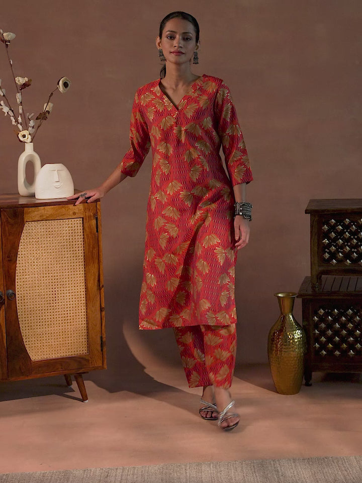 Our 2-piece orange printed silk blend co-ord set features a straight-fit kurta with a V-neckline and three-quarter sleeves. Complemented with matching trousers with a partially elasticated waistband and roomy pockets. Elevated with floral prints and fabric-trim detailing, this style is perfect for casual outings.