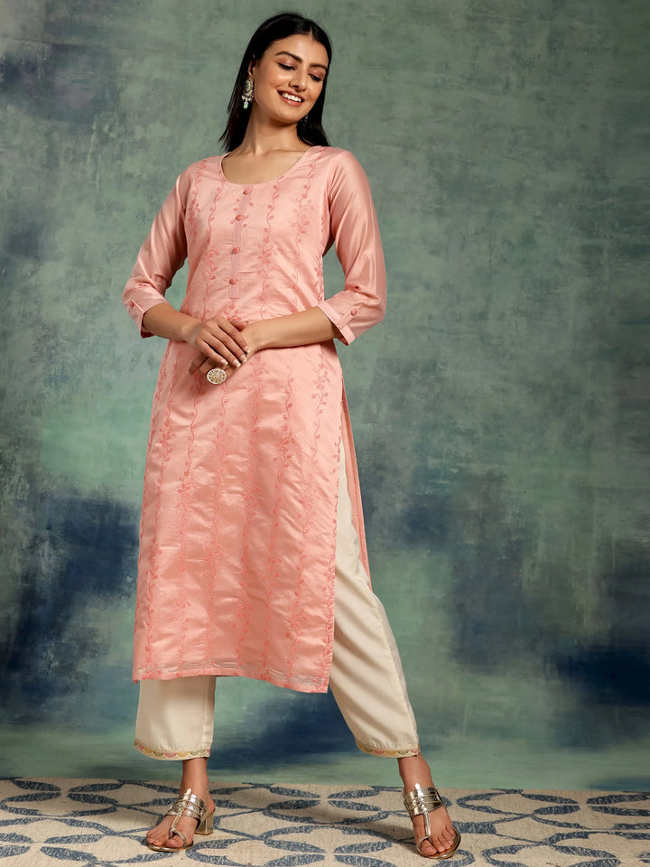 Our peach Chanderi silk straight-fit kurta features a round neckline and three-quarter sleeves. Elevated with floral woven design and handcrafted fabric buttons, this style is perfect for casual outings.
