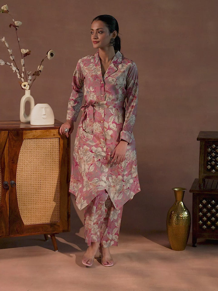 Our 3-piece pink printed silk blend co-ord set features an A-line shirt-style kurta with a lapel collar, comfortable full sleeves, and buttoned-down detailing. Complemented with a fabric waist belt and partially elasticated trousers with pockets, this chic style is perfect for casual outings.