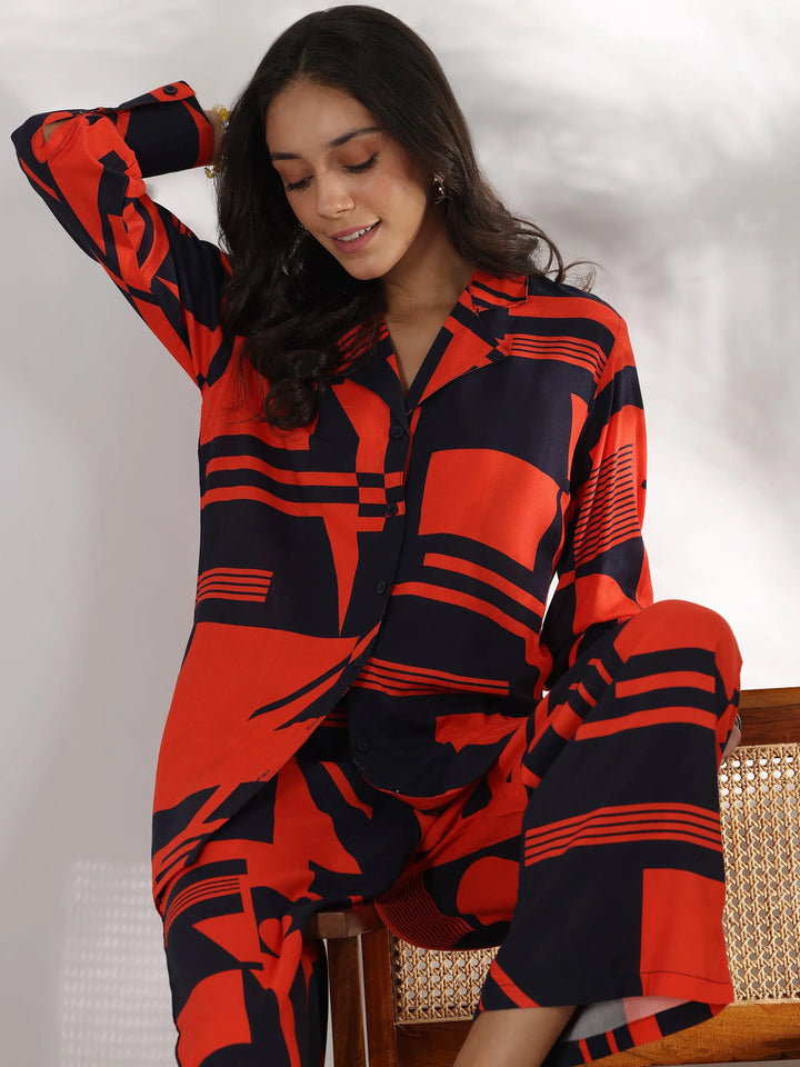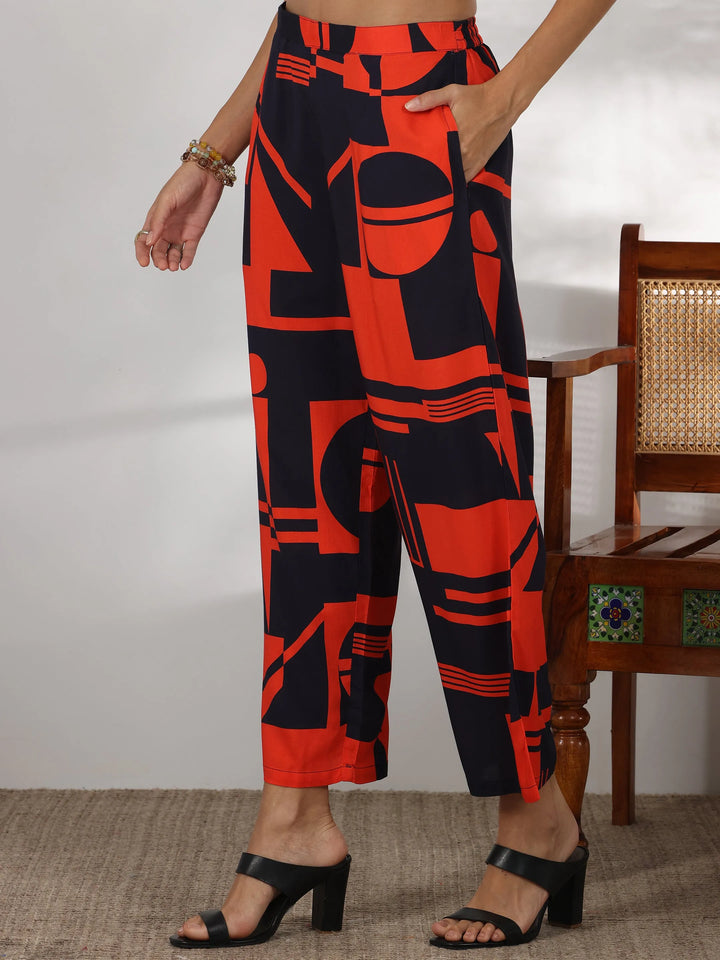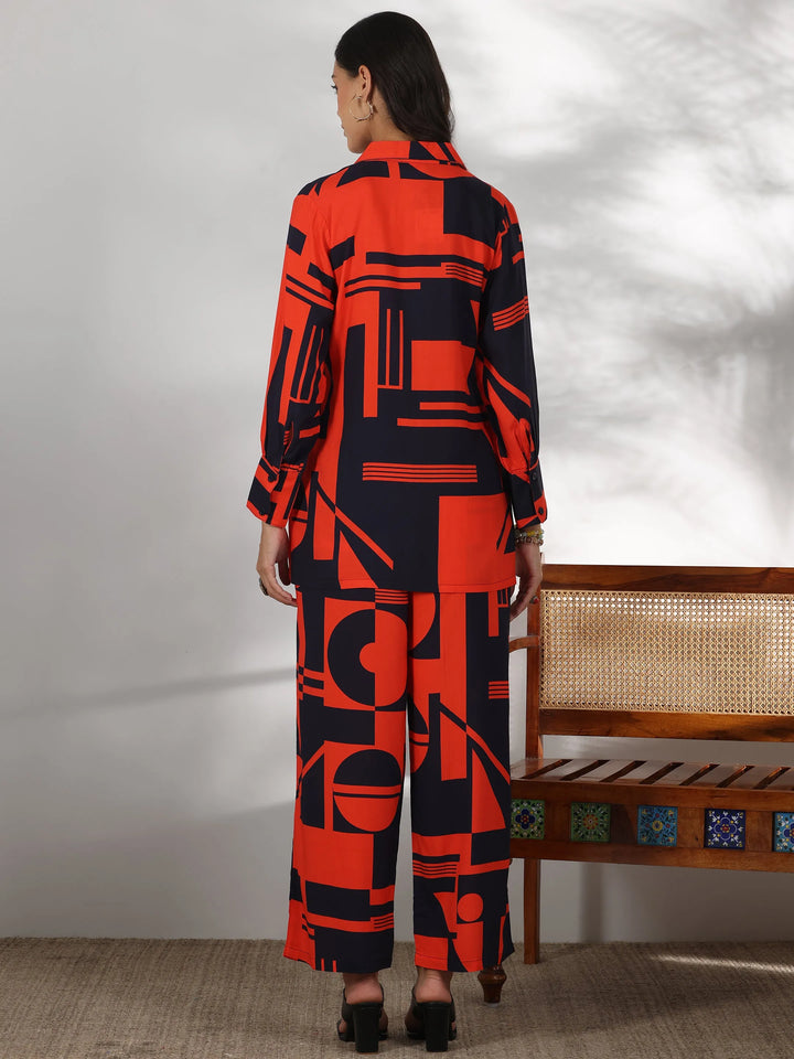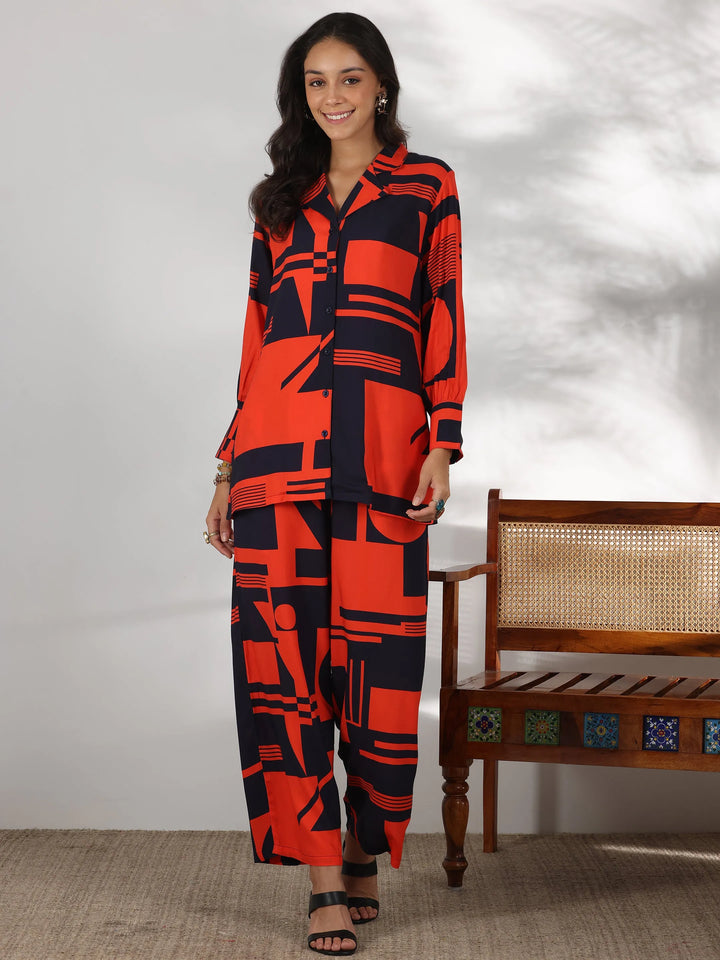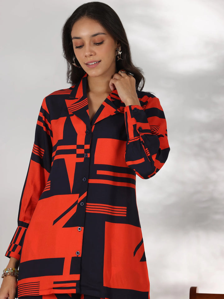 Our 2-piece red printed rayon co-ord set features a shirt-style tunic with a buttoned-down detailing and full-length bishop sleeves. Complemented with matching trousers with a partially elasticated waistband and roomy pockets. Elevated with stylish button accents and geometric prints, this style is perfect for casual outings.