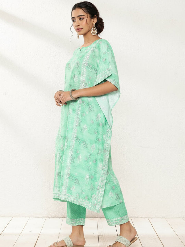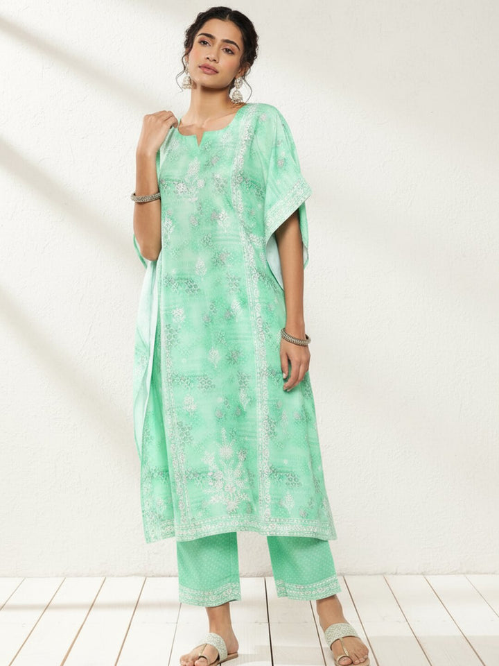 Sea Green Printed Silk Blend Kaftan Kurta With Trousers