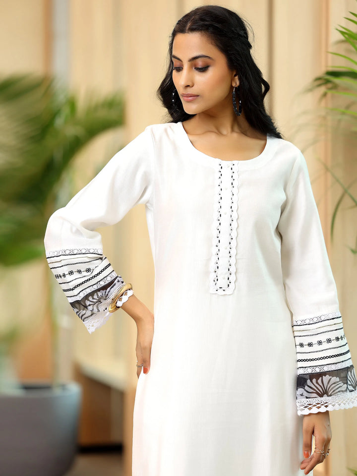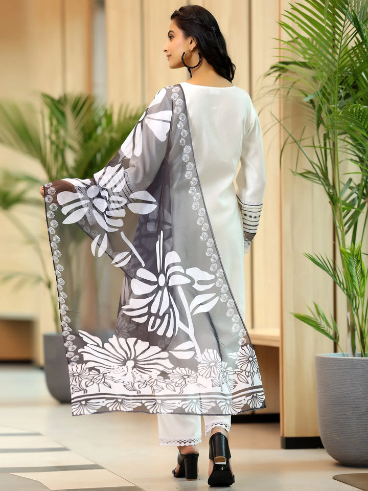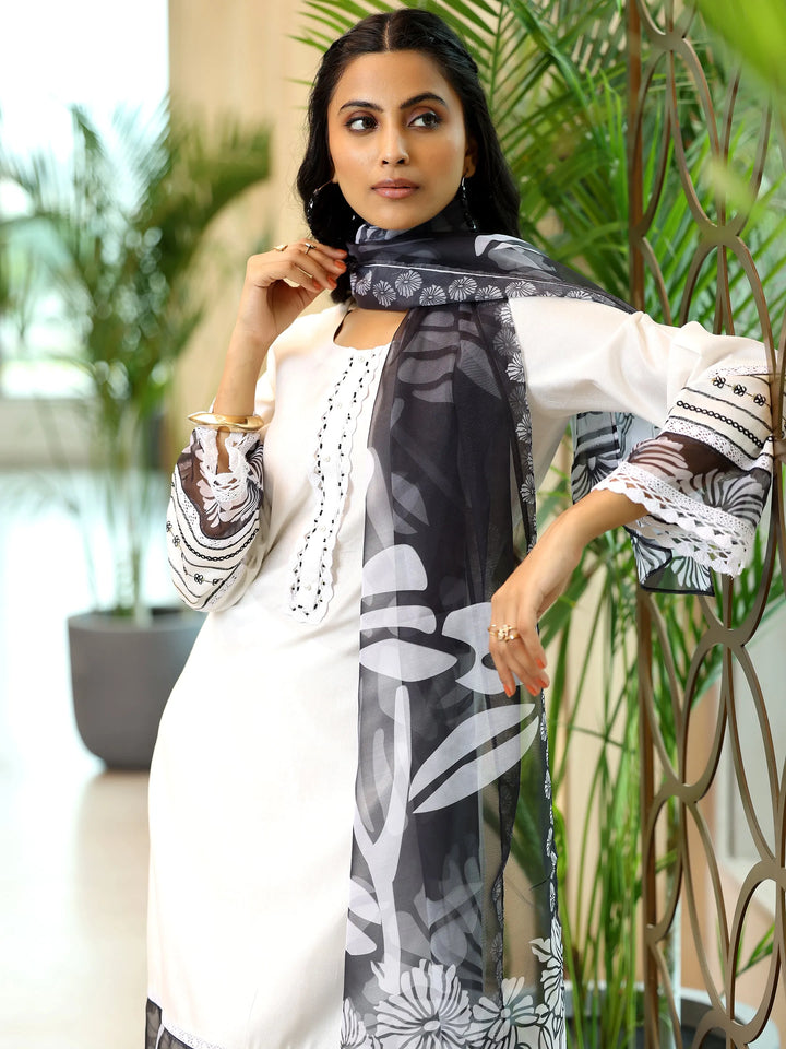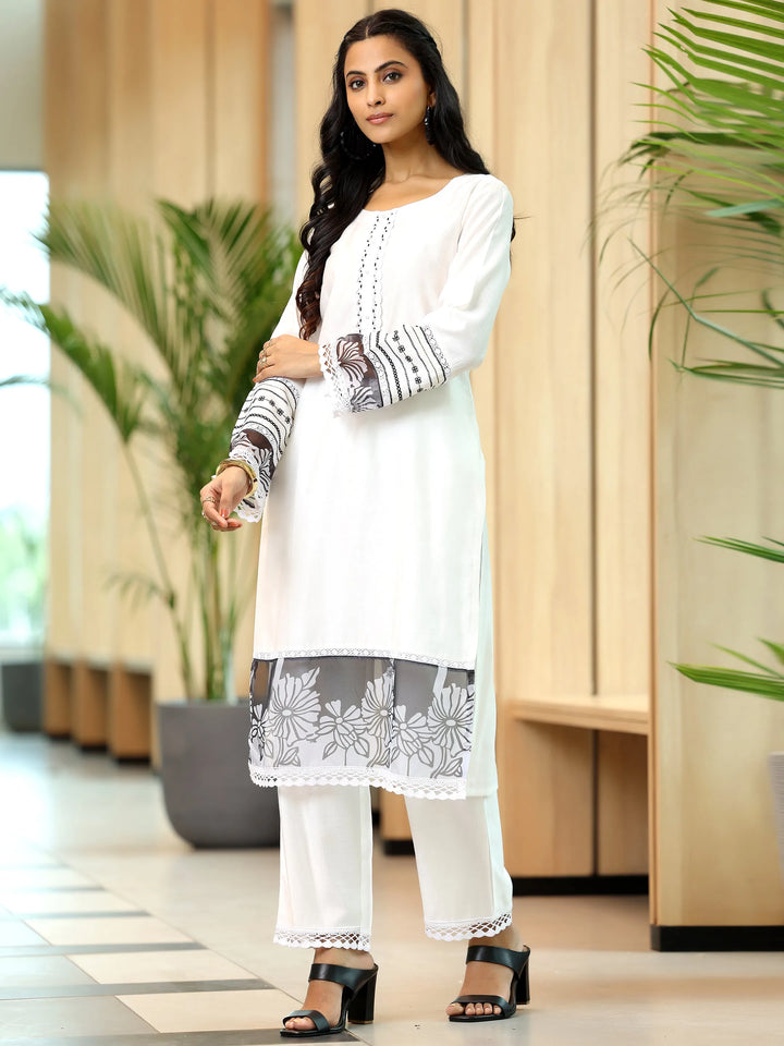 Our 3-piece white silk blend straight suit set features a round neckline kurta and comfortable flared sleeves. Complemented with trousers with a partially elasticated waistband and roomy pockets, and a dupatta. Highlighted with captivating floral prints and lace detailing, this style is perfect for work and beyond.