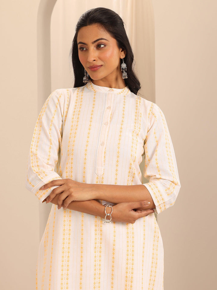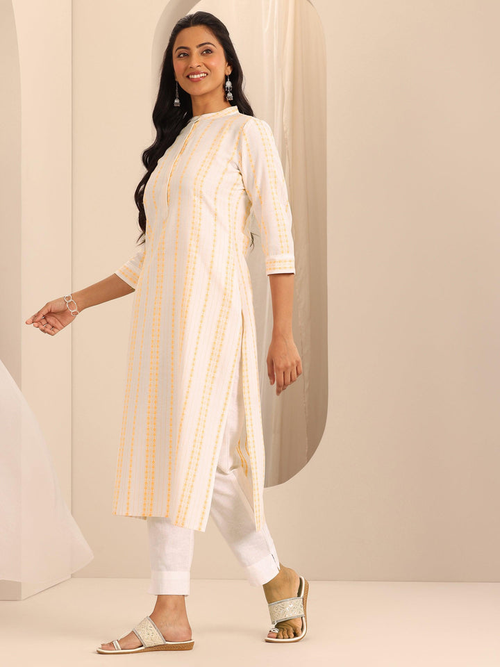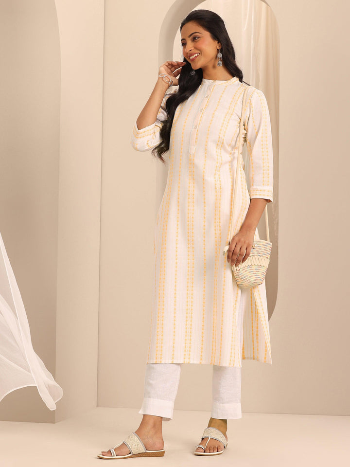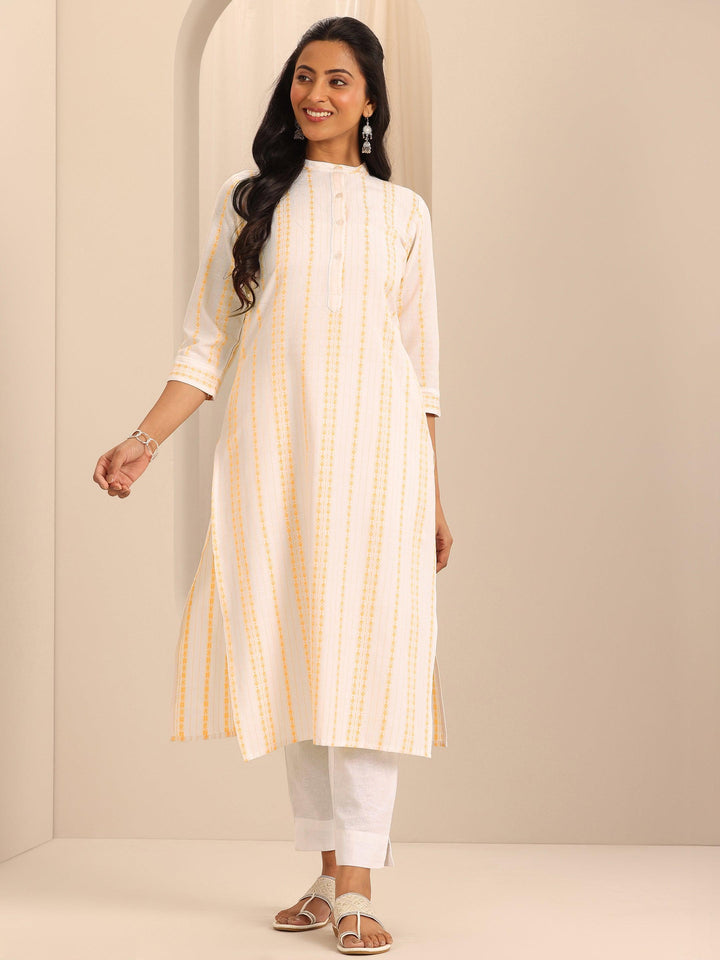 Our white woven design cotton straight kurta features a mandarin collar and three-quarter sleeves. Elevated with ethnic motifs woven design and stylish button accents, this style is perfect for work and beyond.