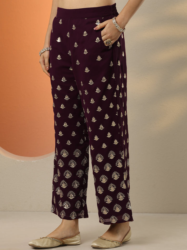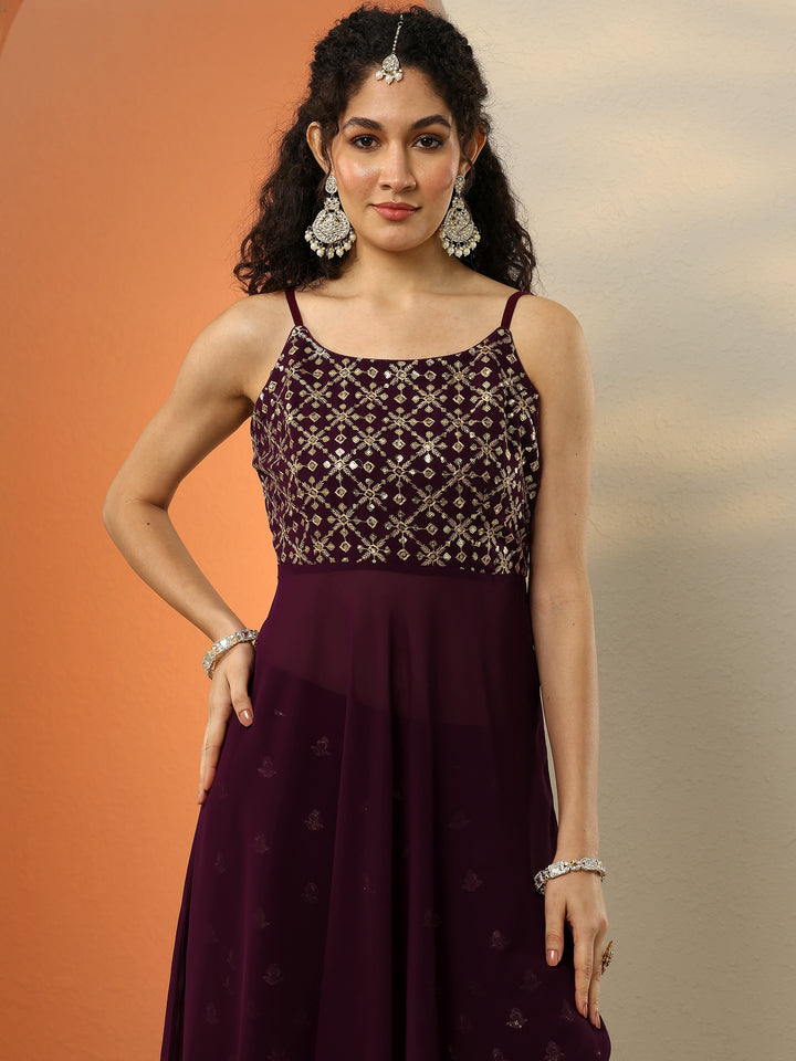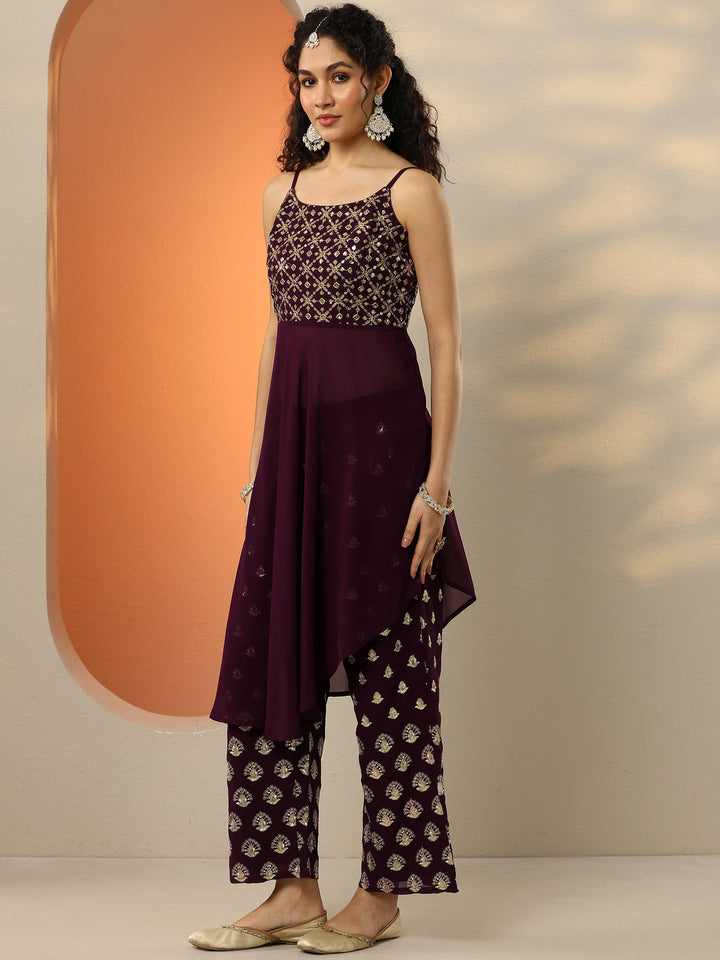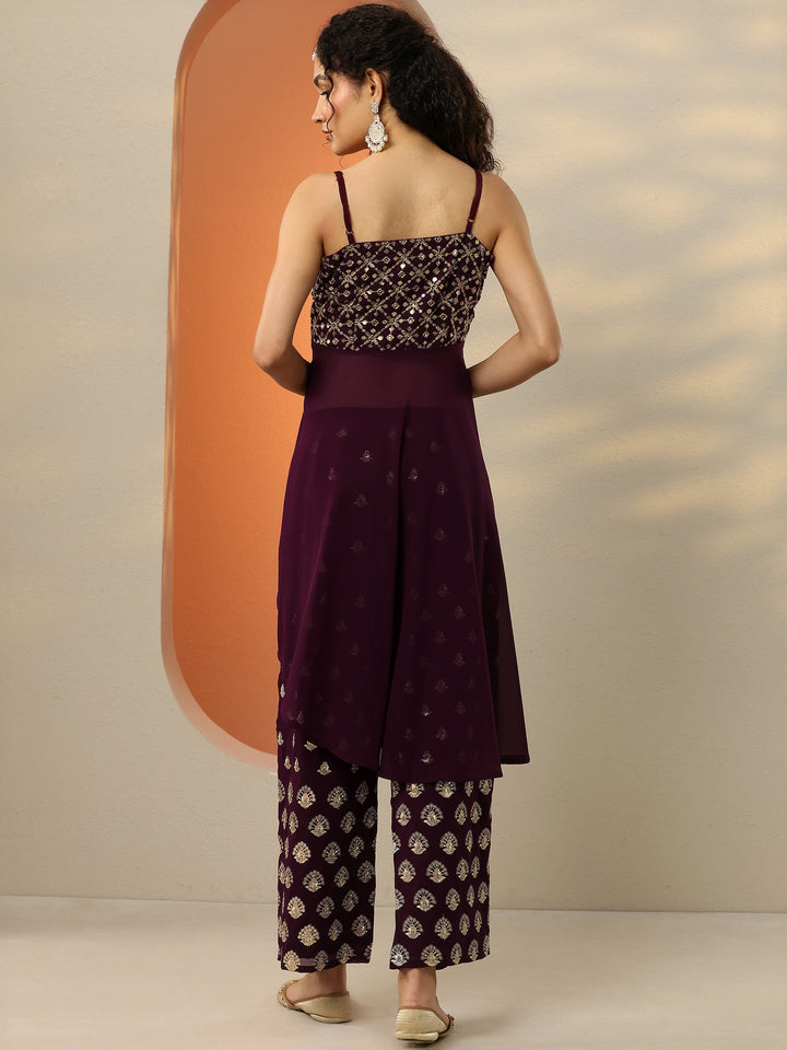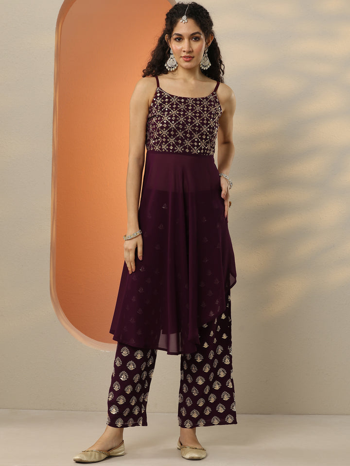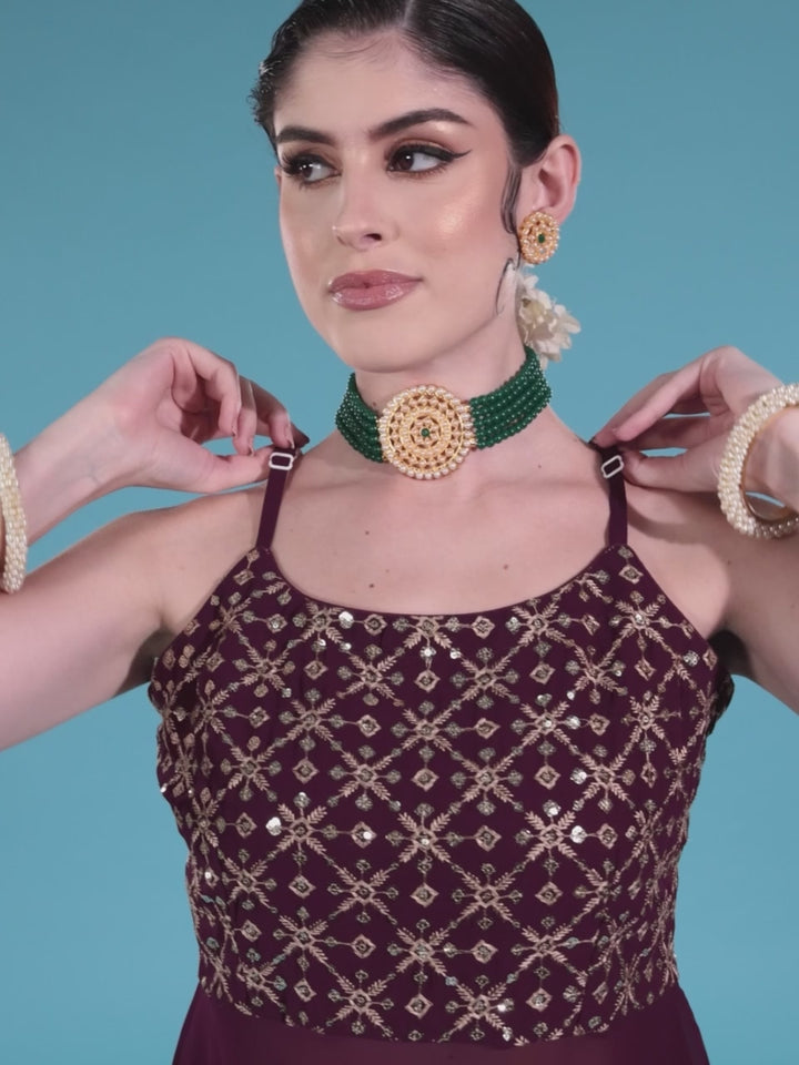 Our 2-piece burgundy georgette co-ord set features a sleeveless, asymmetrical tunic with a strappy neckline. Complemented with palazzo pants with a partially elasticated waistband and roomy pockets. Adorned with sequin detailing and intricate embroidery, this co-ord set is ideal for festive celebrations.