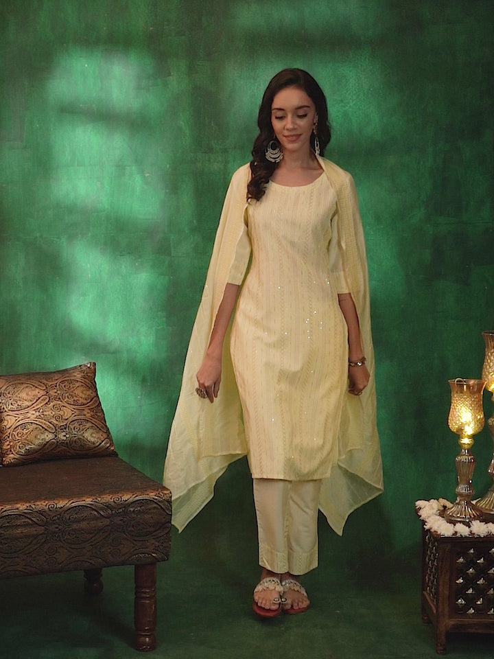 Our 3-piece yellow silk blend suit set features a straight-fit kurta with a round neckline and three-quarter sleeves. Complemented with trousers with a partially elasticated waistband and roomy pockets, and a dupatta. Highlighted with sequins and thread work, this style is perfect for light festivities.
