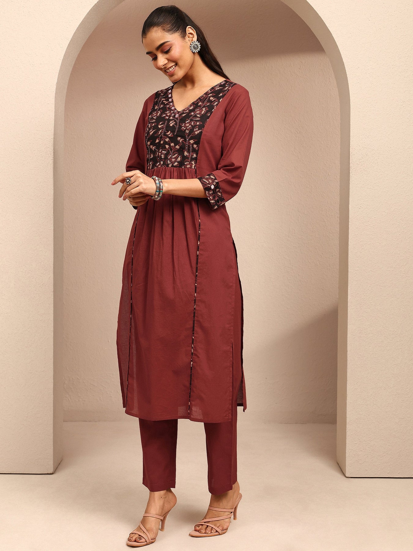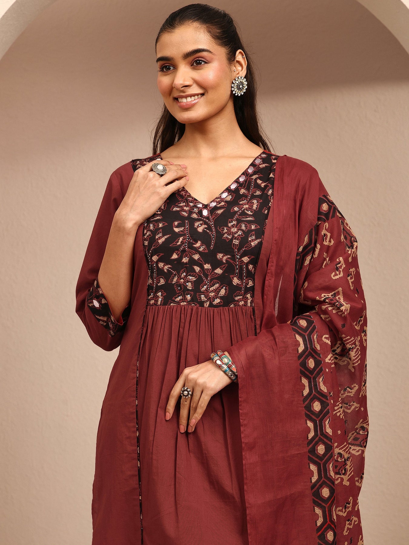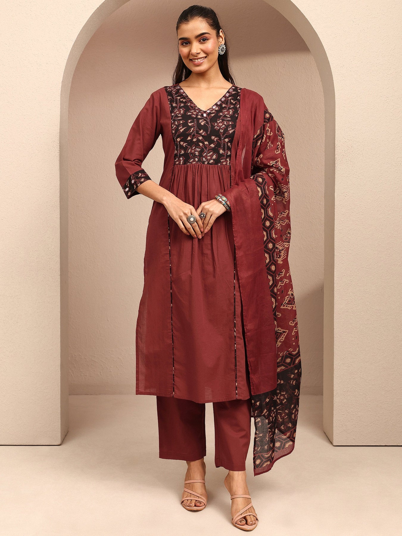 Our 3-piece maroon cotton A-line kurta set features a V-neckline, regular sleeves, and statement yoke. Complemented with straight pants with a partially elasticated waistband and 2 pockets, and a printed dupatta. Adorned with floral ajrakh printed, this style is perfect for dark festive occasions.