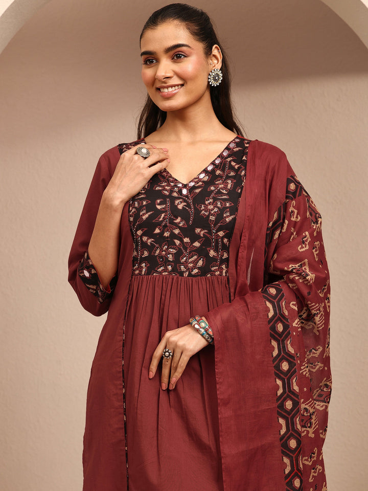 Rust Printed Cotton A-Line Suit Set With Dupatta