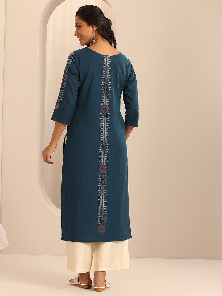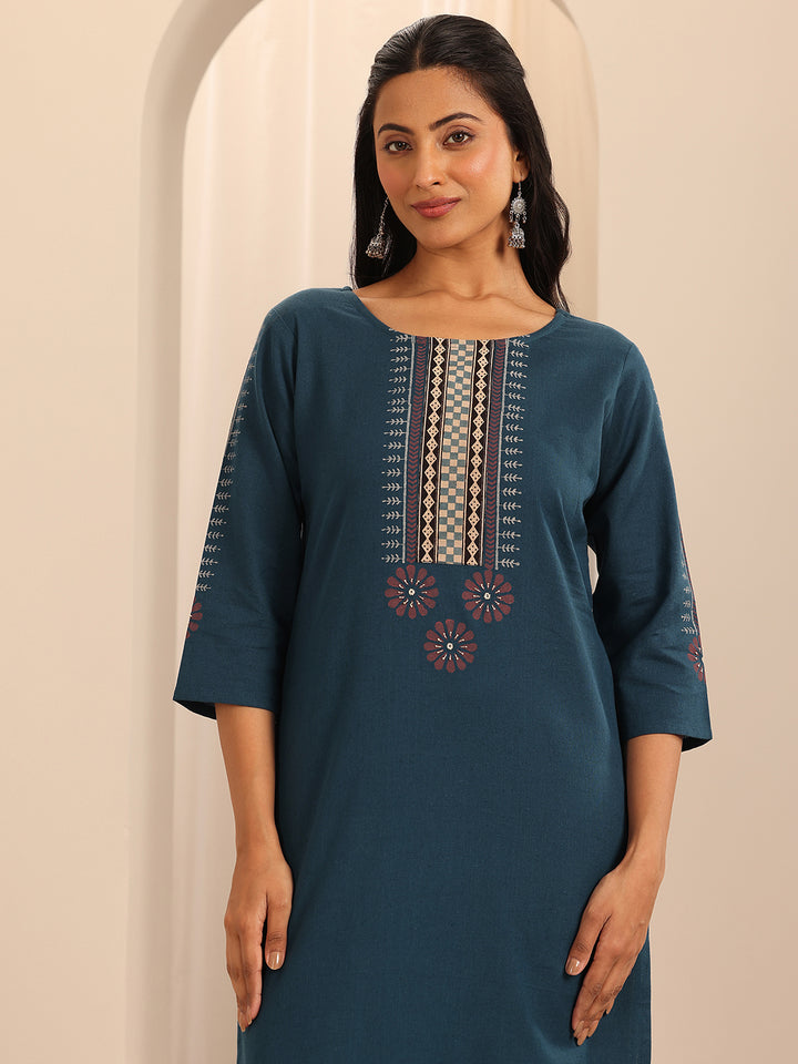 Our 1-piece teal cotton blend features a straight-fit kurta with a round neckline, regular sleeves, and statement Yoke. Adorned with ethnic motifs prints, this style is perfect for casual wear.