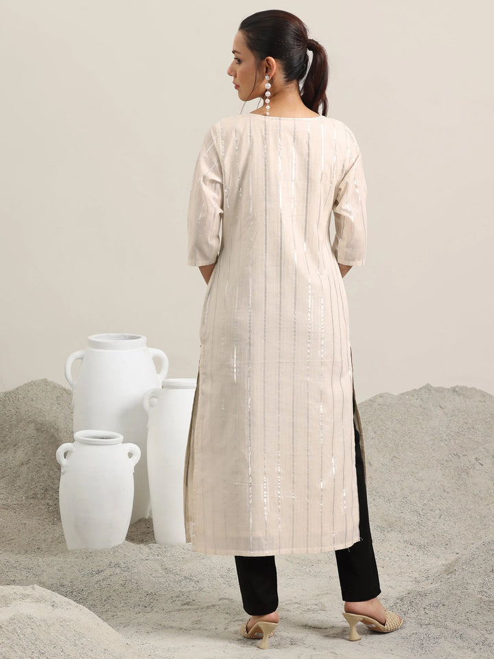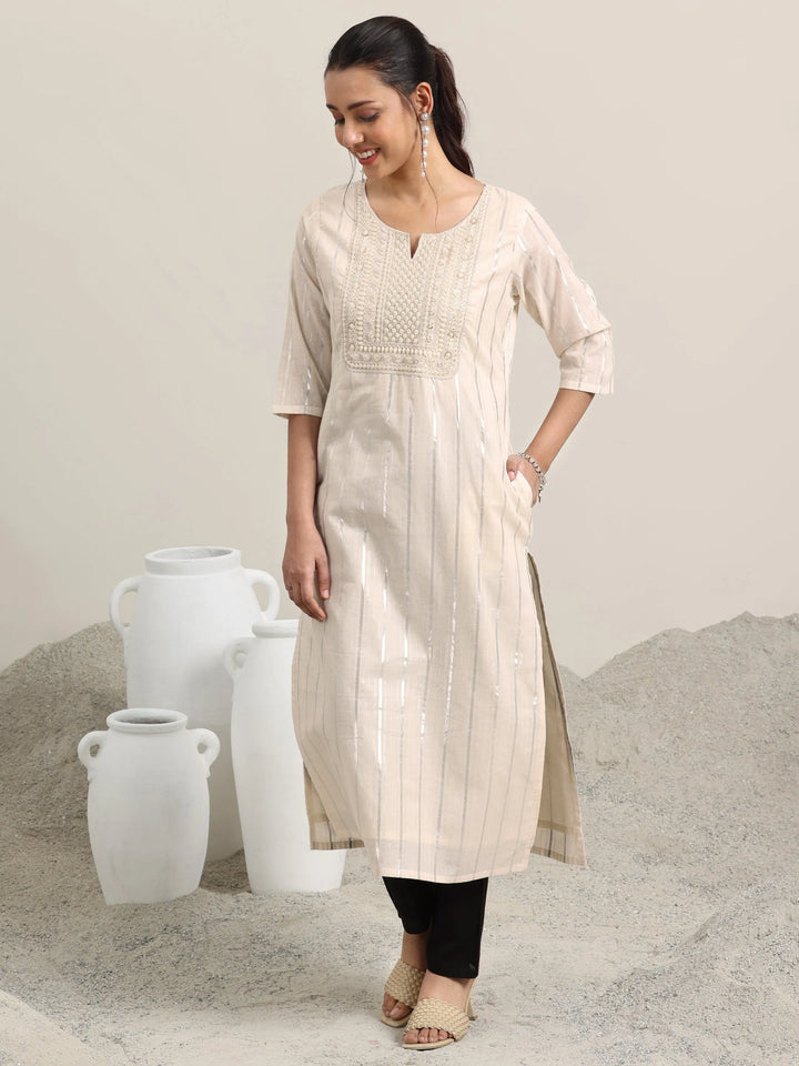 Our off white embellished cotton straight kurta features a kurta with a notched neckline, three-quarter sleeves, and a statement yoke. Highlighted with beaded accents and sequins, this style is perfect for casual outings.