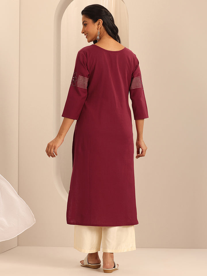 Our 1-piece maroon cotton blend straight-fit kurta features a round neckline, regular sleeves and statement Yoke. Adorned with ethnic motifs prints, this style is perfect for casual wear.