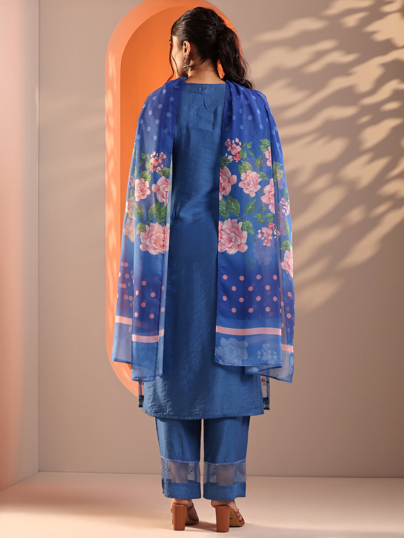 Our 3-piece Blue Silk blend Straight-fit Kurta Set features a Round Neckline, Regular Sleeves, and statement yoke. Complemented with Straight Pants with a Partially Elasticated waistband and 2 pockets, and a Printed dupatta. Adorned with floral embroidered accents, this style is perfect for Festive occasions.