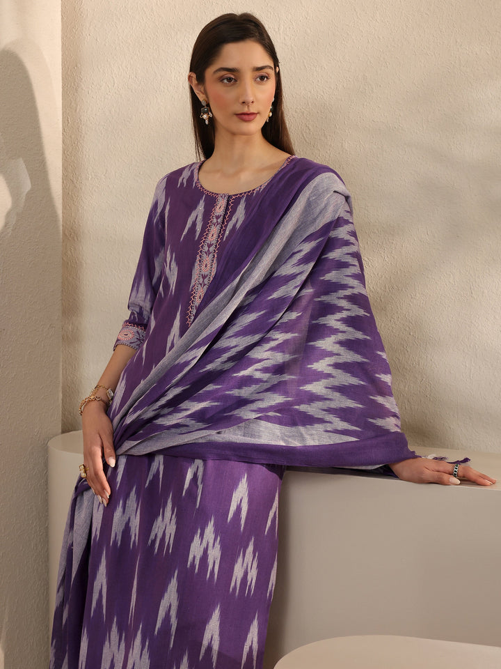 Purple Ikkat Printed Cotton Straight Suit Set With Dupatta