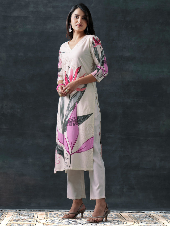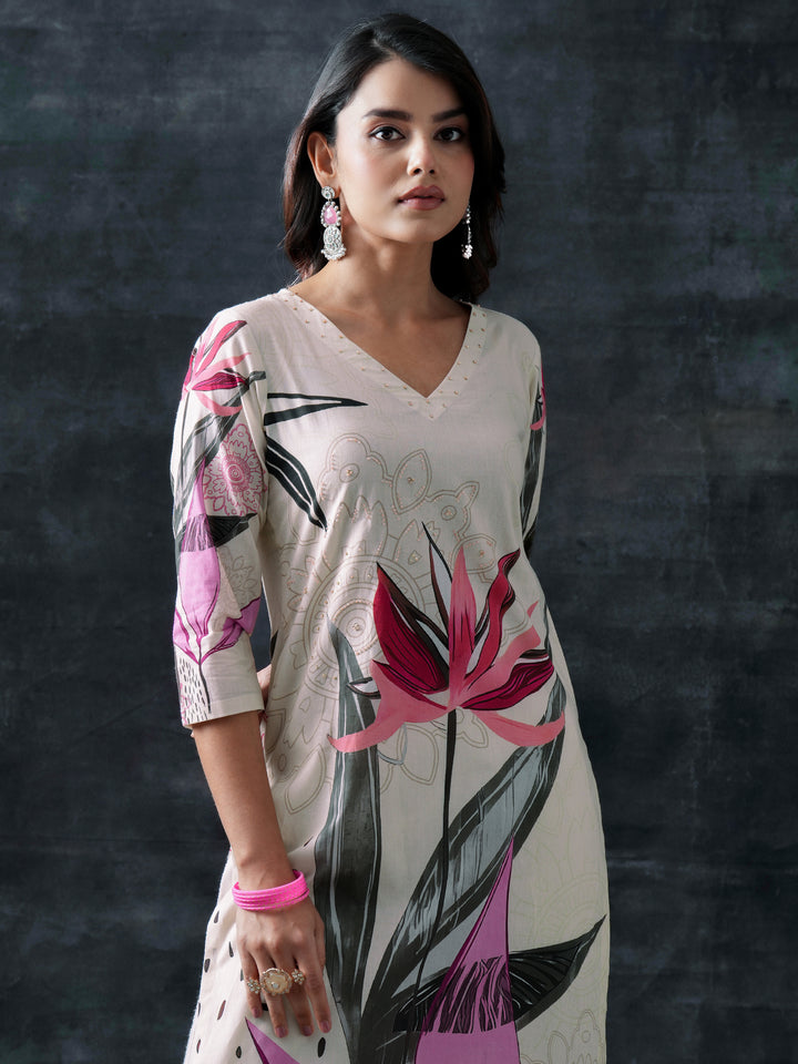 Our 3-piece cream and pink cotton kurta set features a straight-fit design with a V-neckline, regular sleeves, and a statement yoke. Complemented with straight pants with a partially elasticated waistband and 2 pockets, and a floral dupatta. Adorned with floral printed accents, this style is perfect for casual wear.