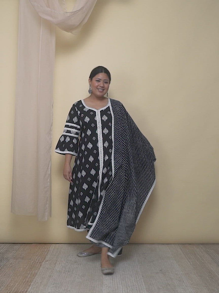Plus Size Black Printed Cotton A-Line Kurta With Palazzos & Dupatta