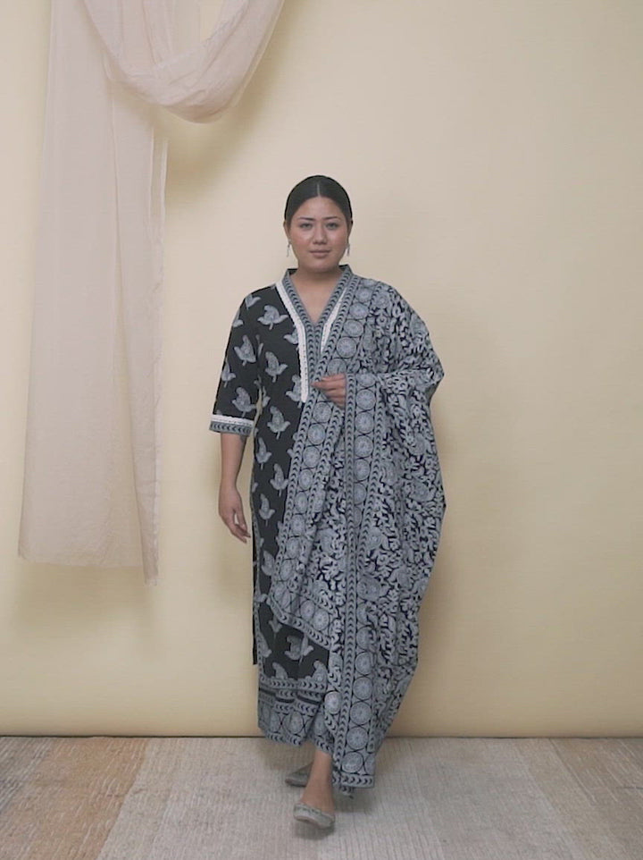 This 3-piece set includes our black Khari print v-neck kurta, matching palazzo pants and printed dupatta. Crafted in cotton for simple comfort. Suitable for evening festivities.
